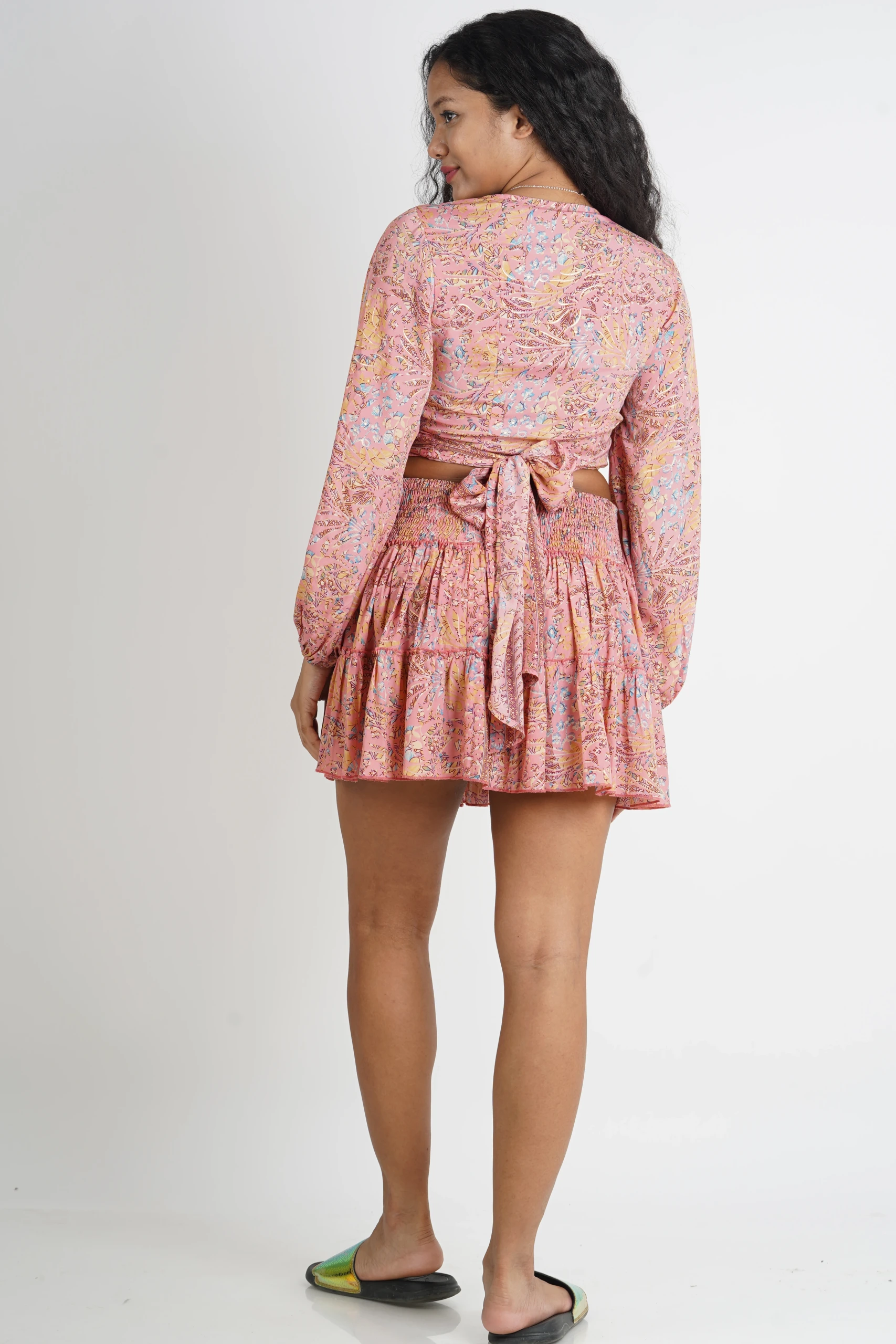 This printed set feature a wrap-tie style top and matching high-rise skirt.
