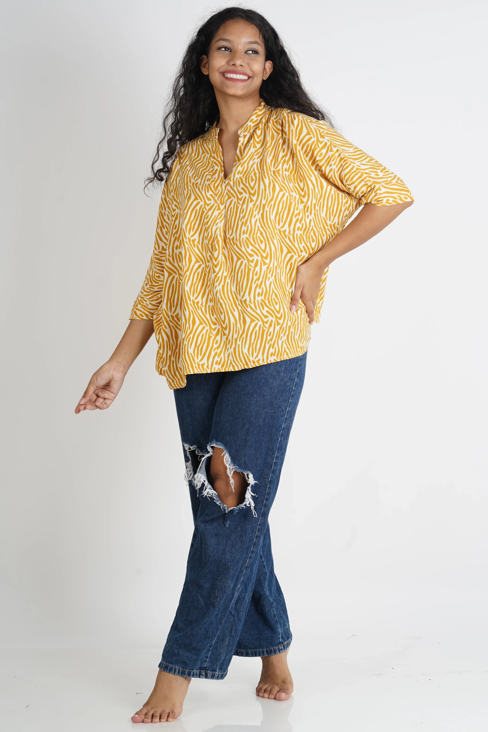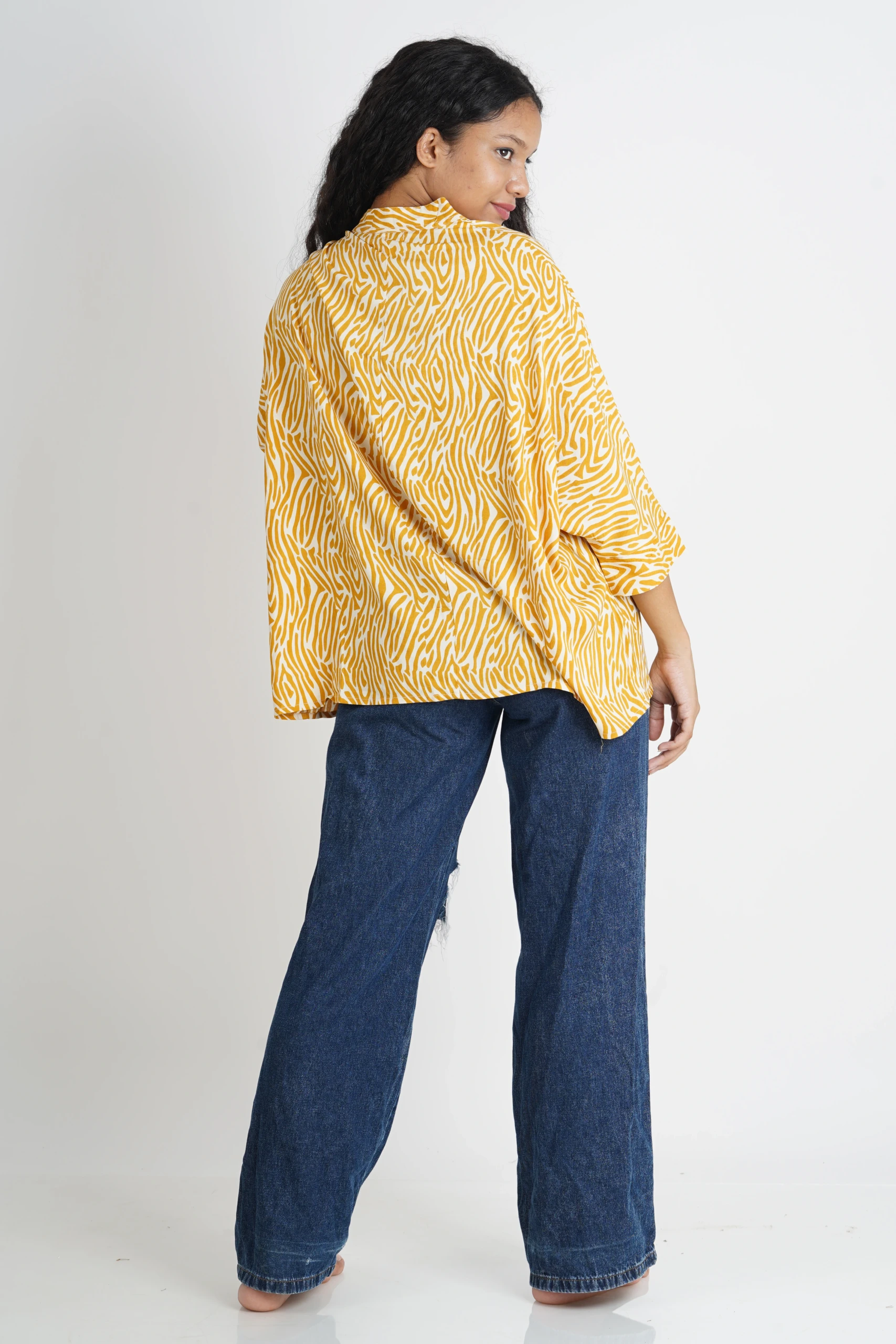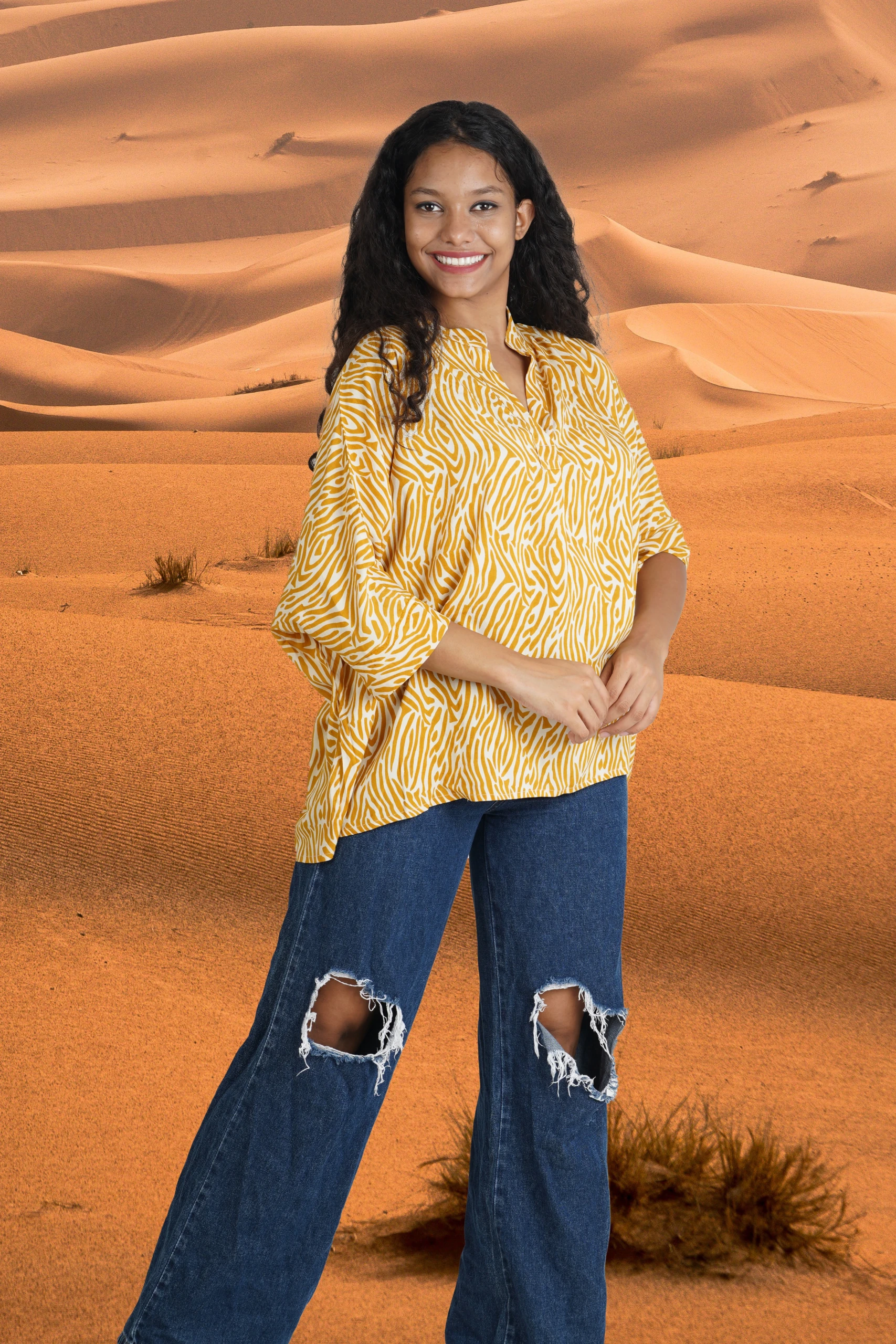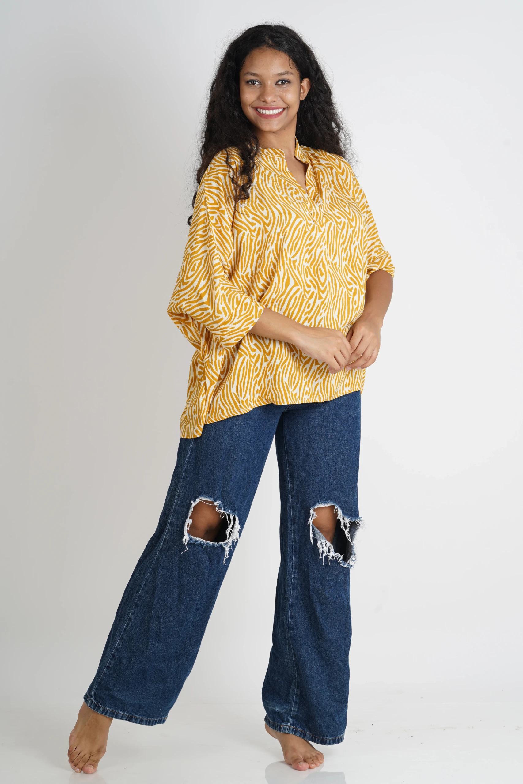 FEATURES- Soft rayon fabrication, mao-collared neckline with placket, slouchy kimono style 3/4 sleeves.