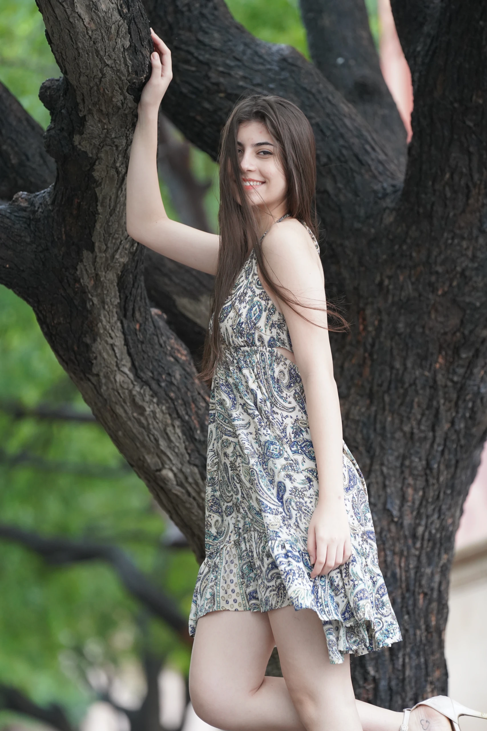 A stunning summer staple, this mini is featured in a printed silky fabrication with cutout details and frill at the bottom.
