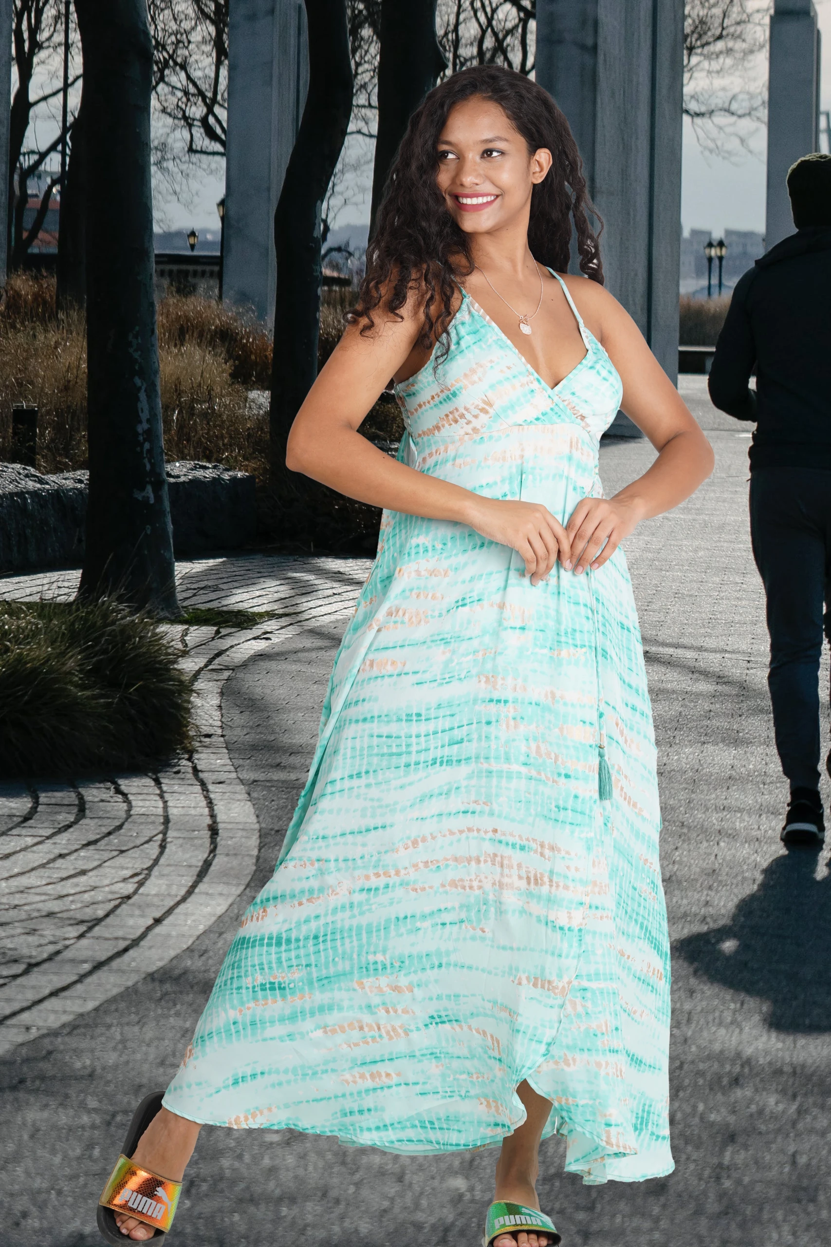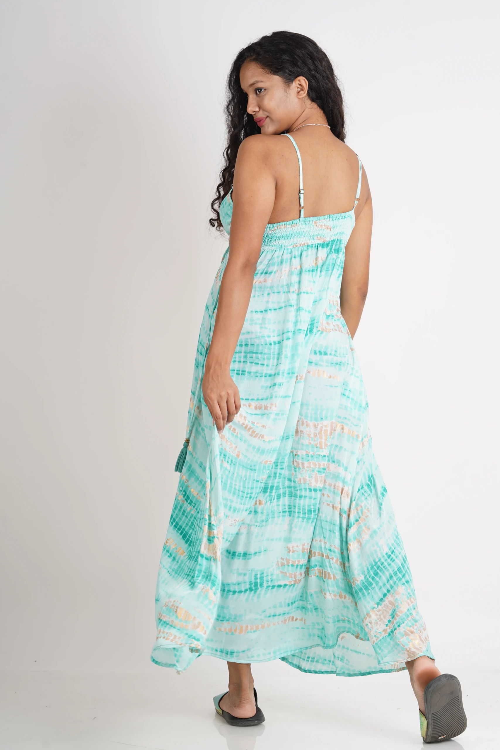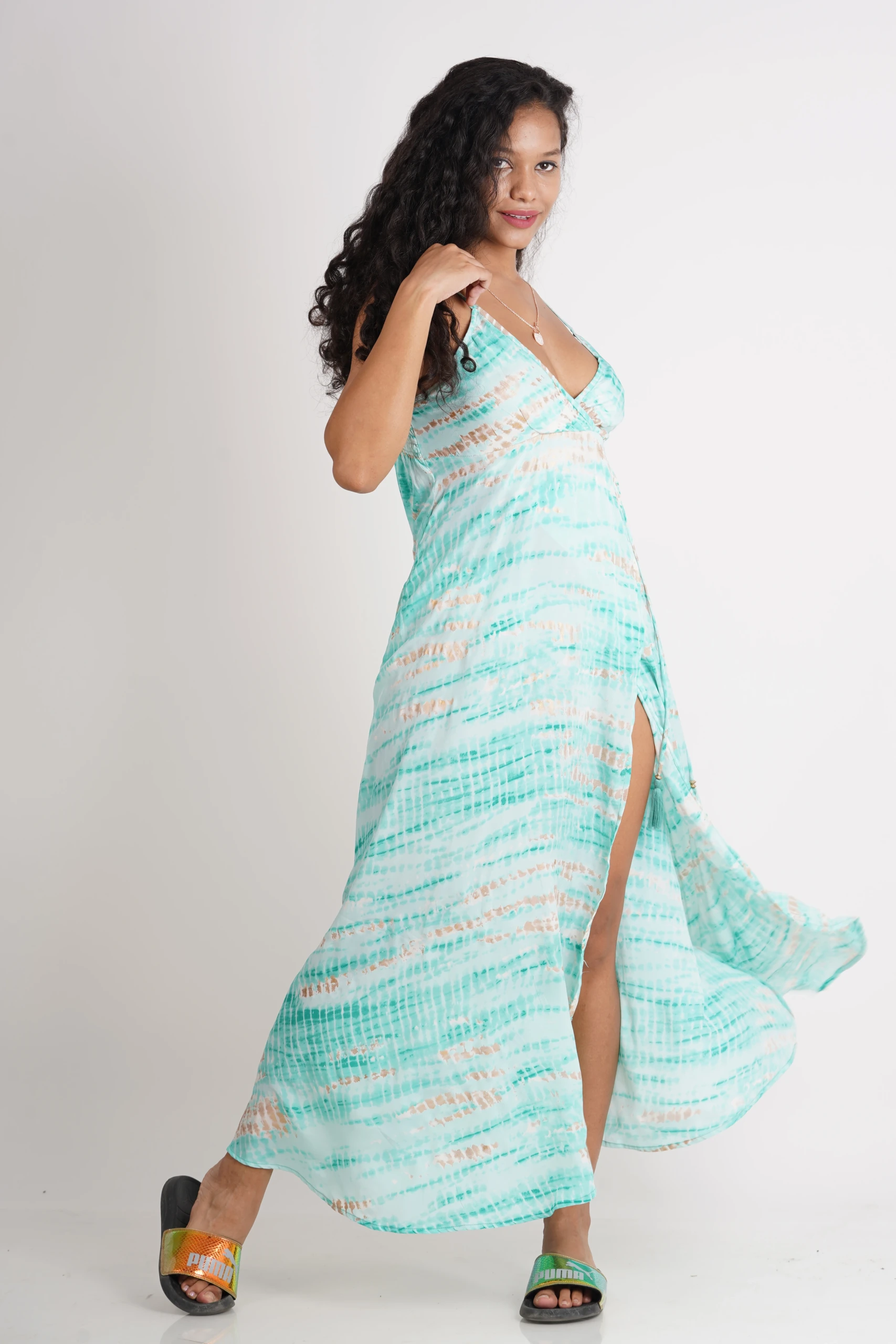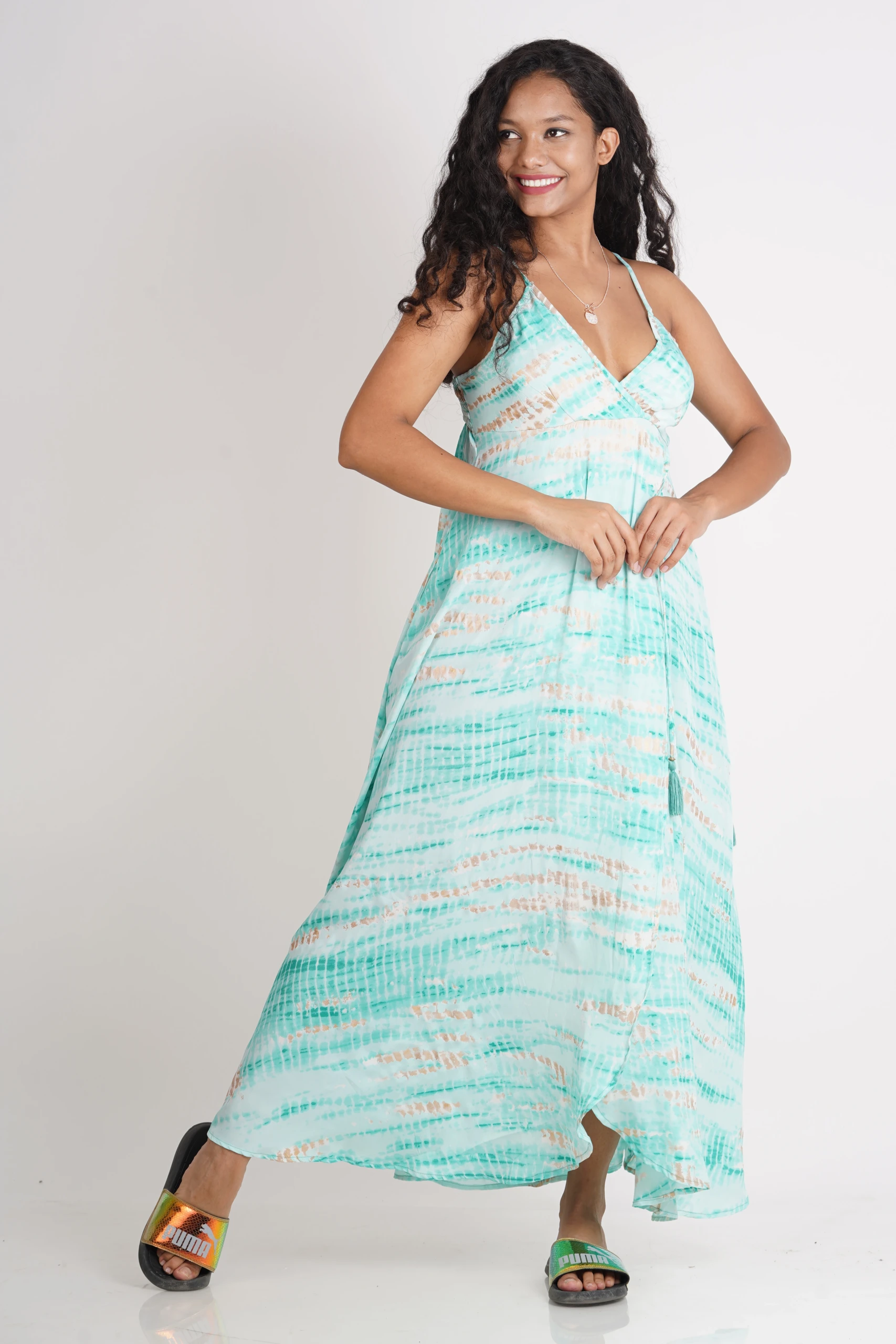FEATAURES- Plunging neckline, thin adjustable shoulder straps, drop-waist detail with fake-wrap skirt & a string attached in the side, side-pockets.