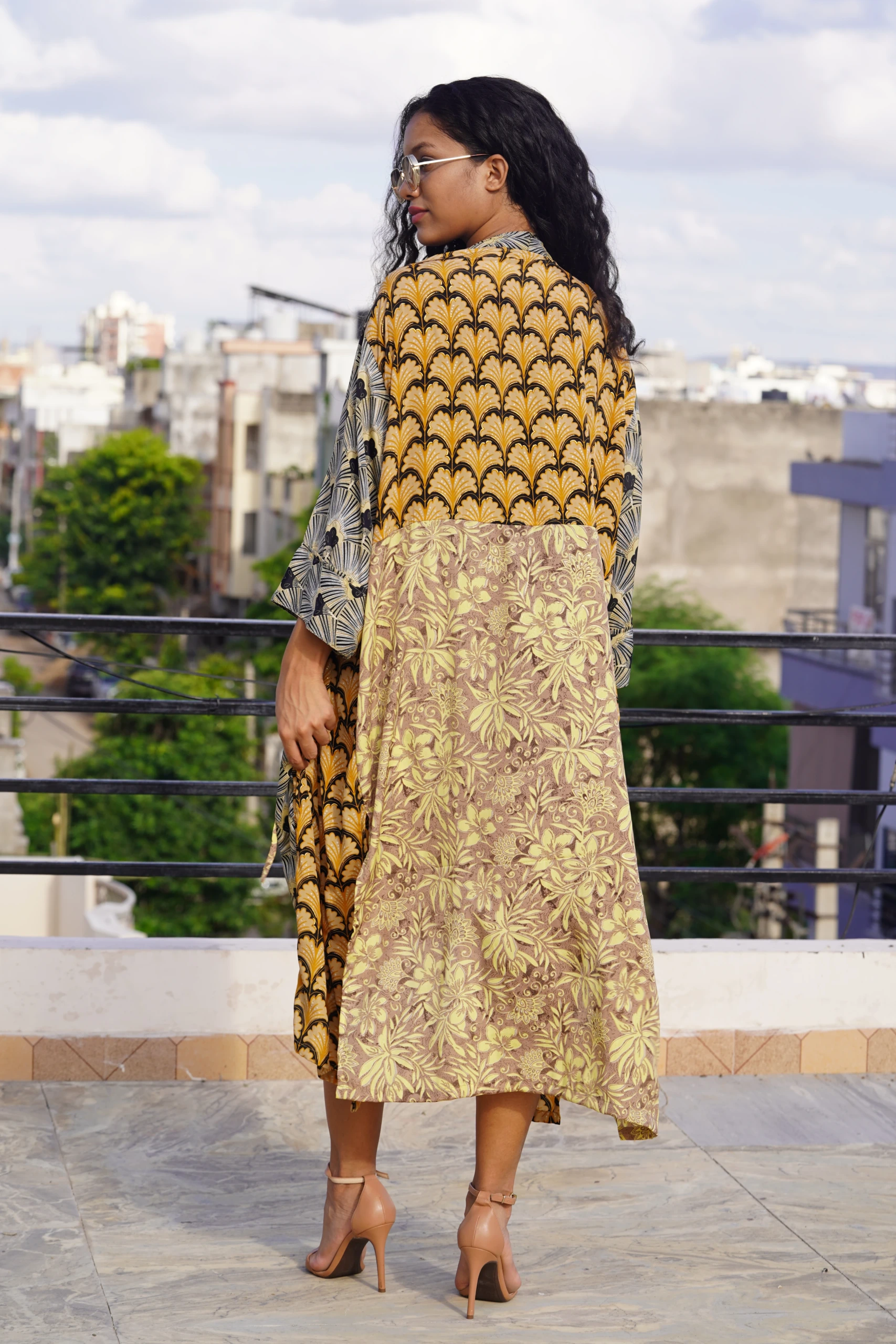 FEATURES- Different patchwork prints, open-front design, waist tie closure, ? length sleeves, two side pockets, side slits.