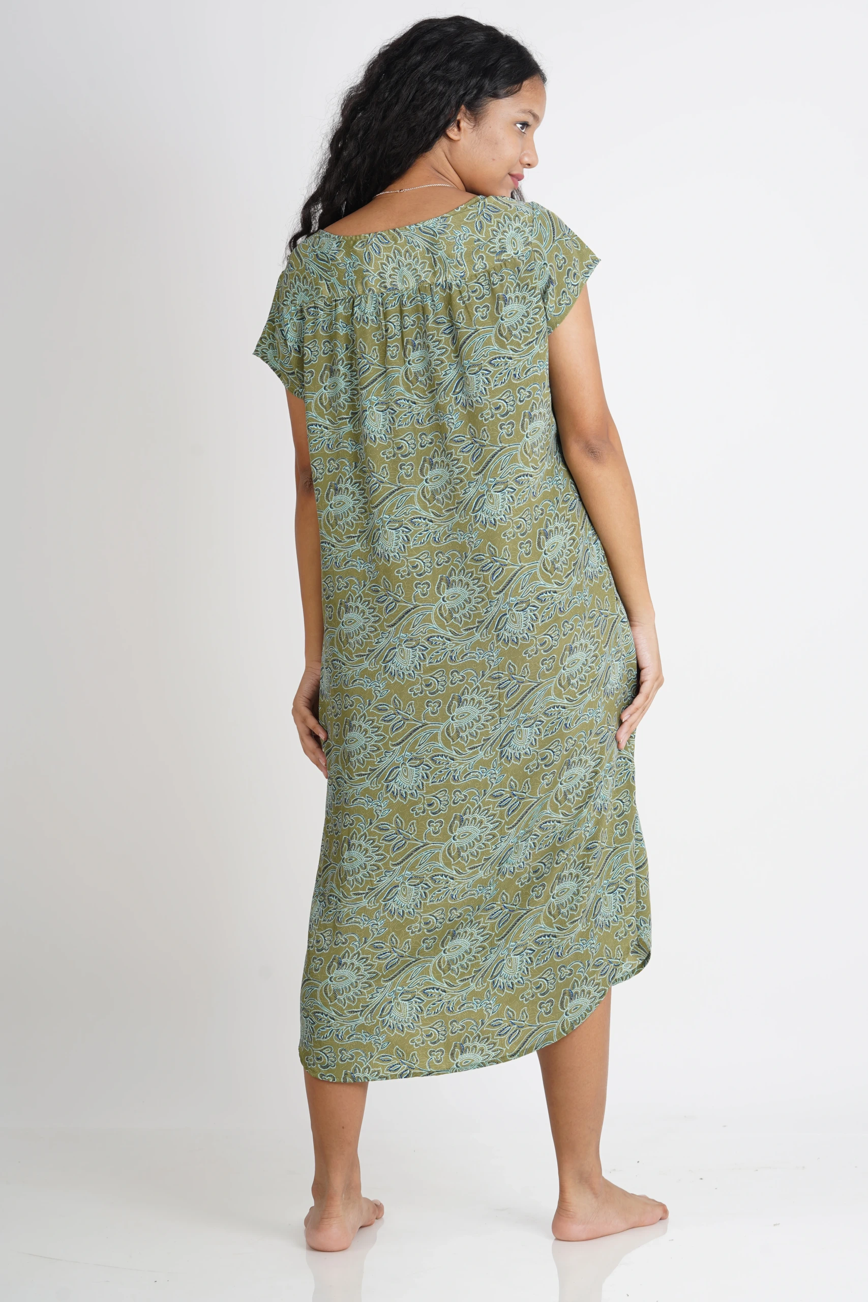 FEATRES- V-neckline, cap sleeves, side-pockets, back side pleated detailing, extra string to tie.