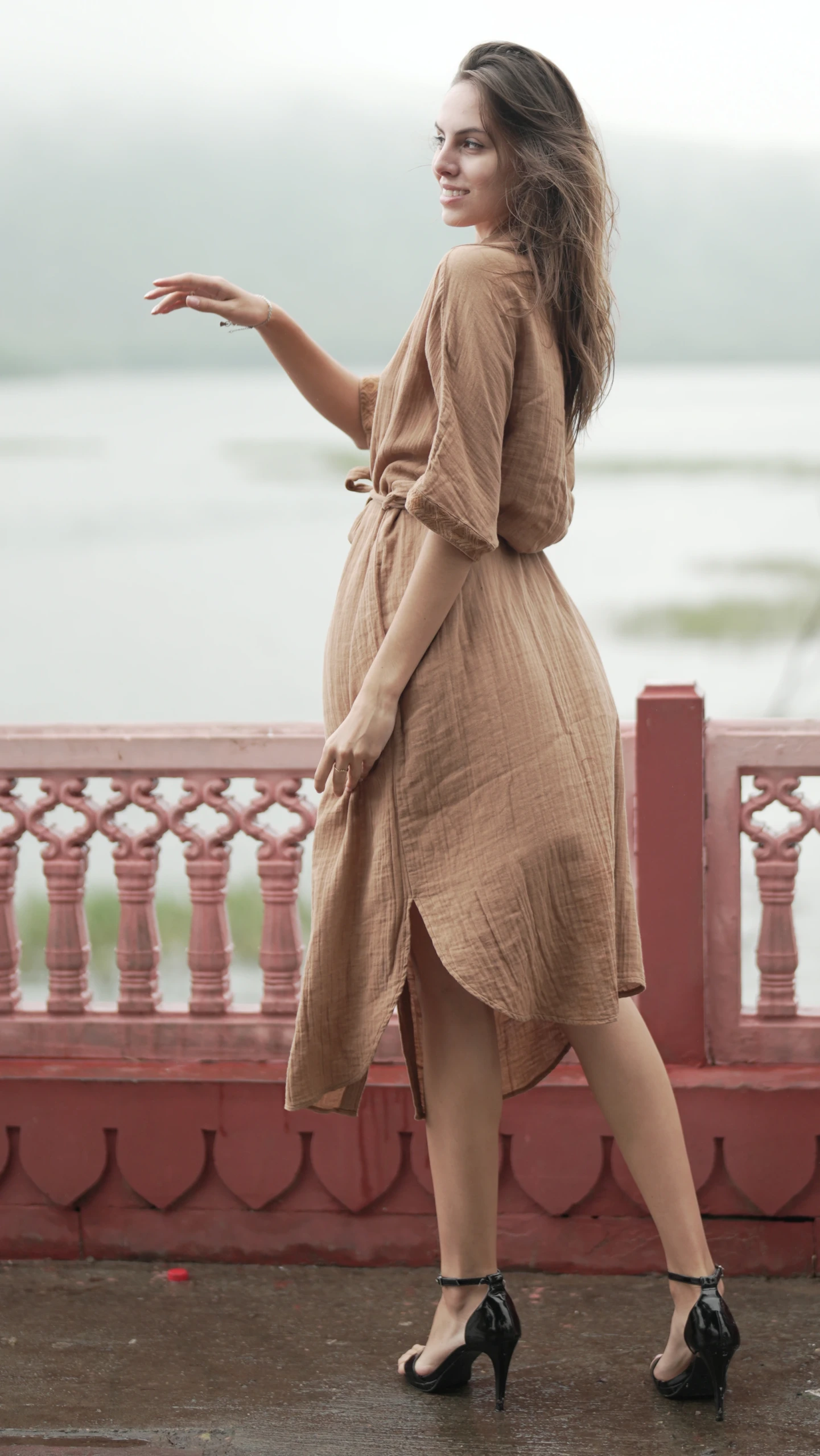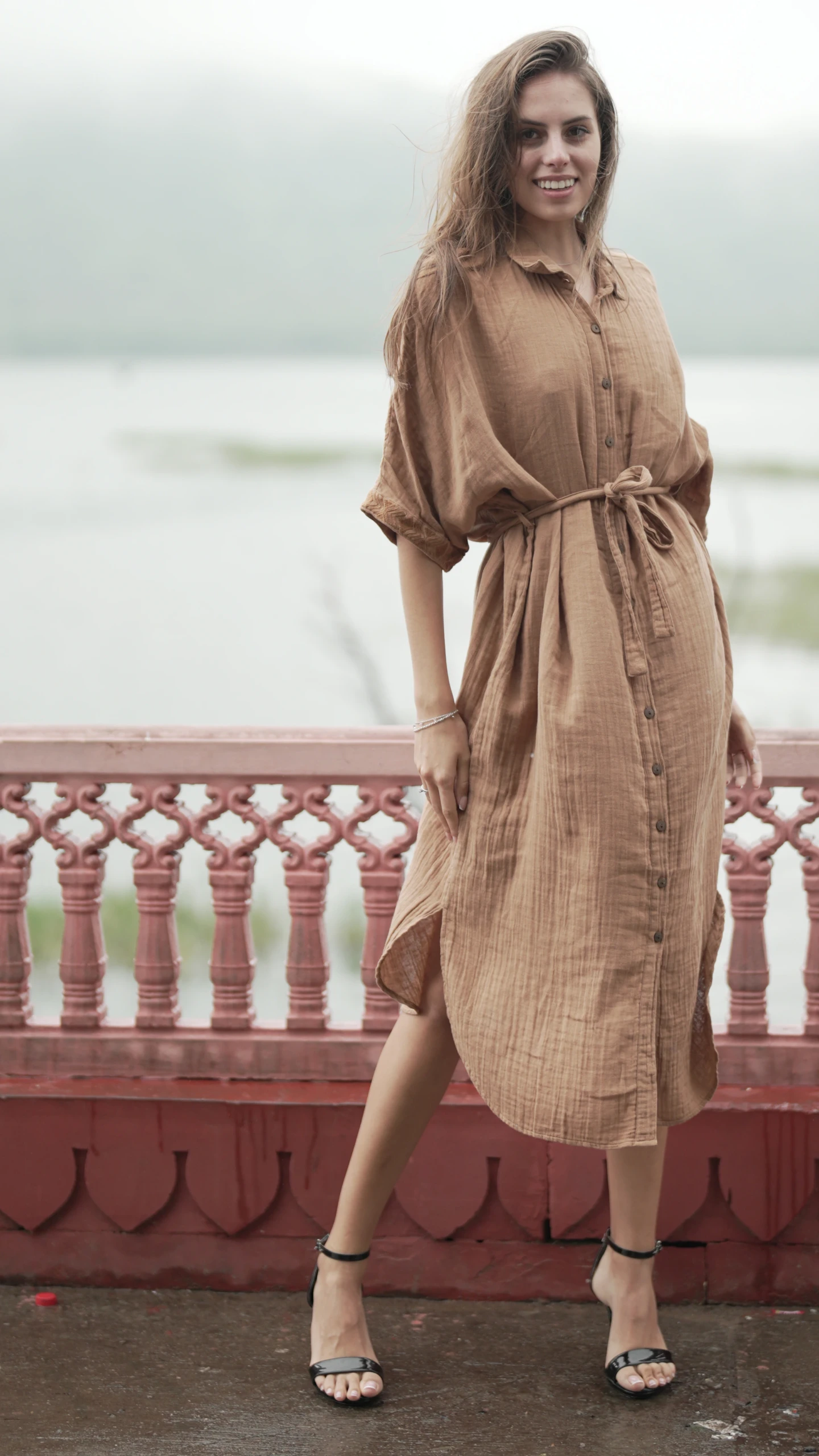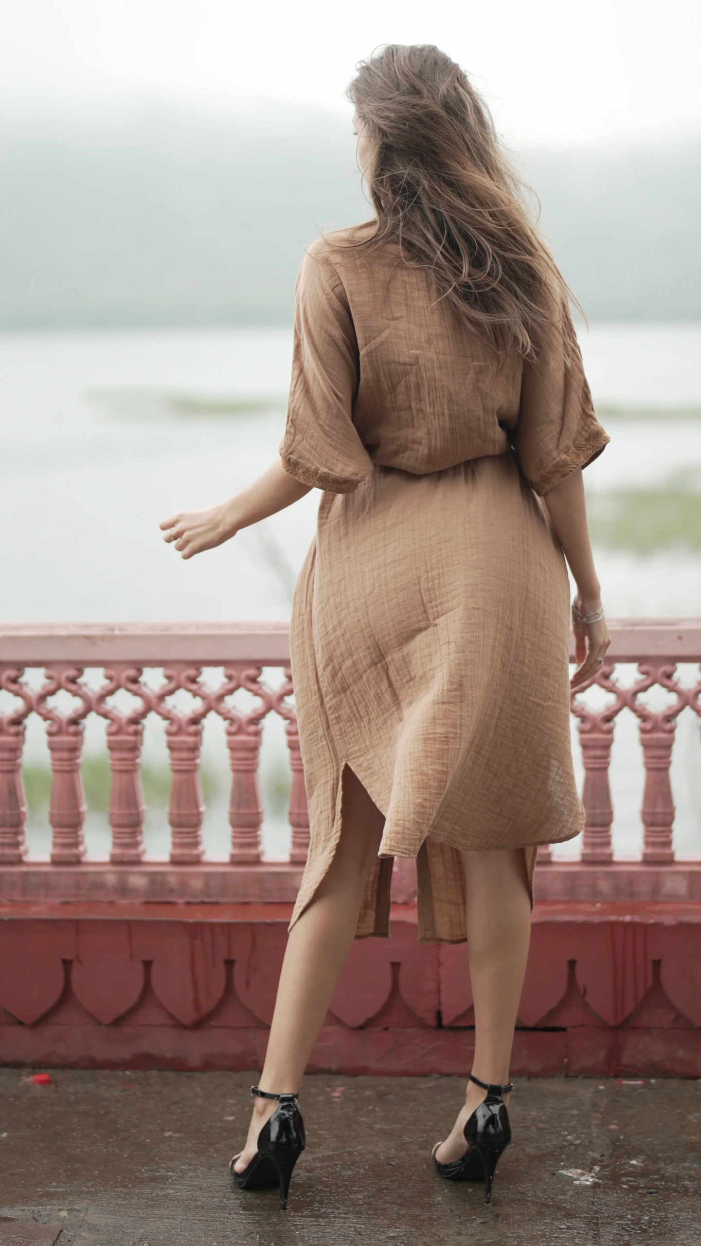 FEATURES- Soft fabrication, V-neckline with mao collar detail, long bell sleeves with fringe lace detailing at the ends, tiered skirt, drop-waist silhouette, button-up closure, pleated yoke on the bust.