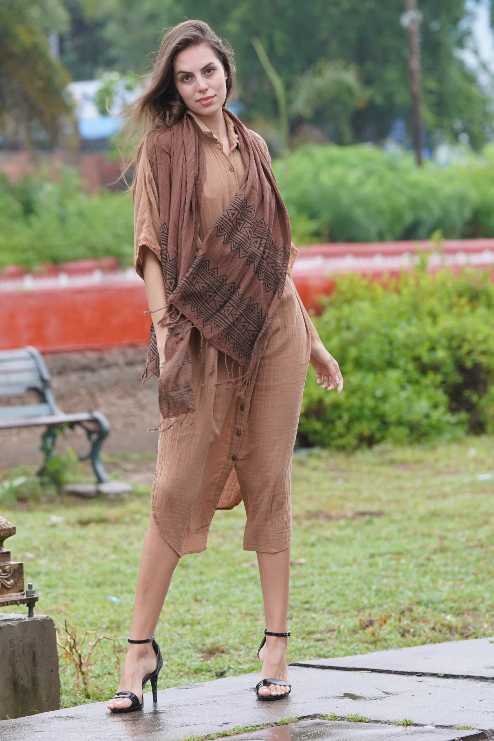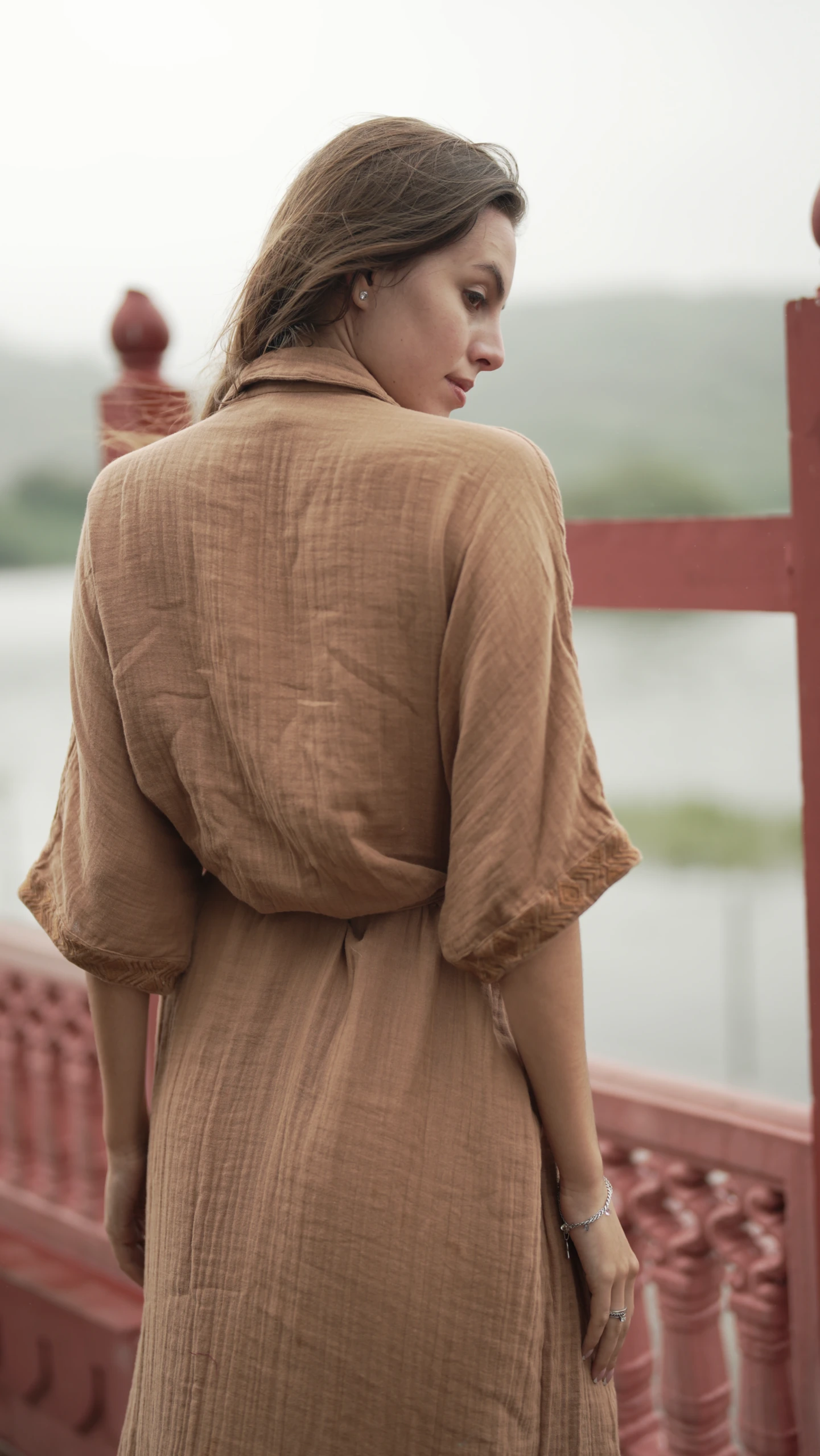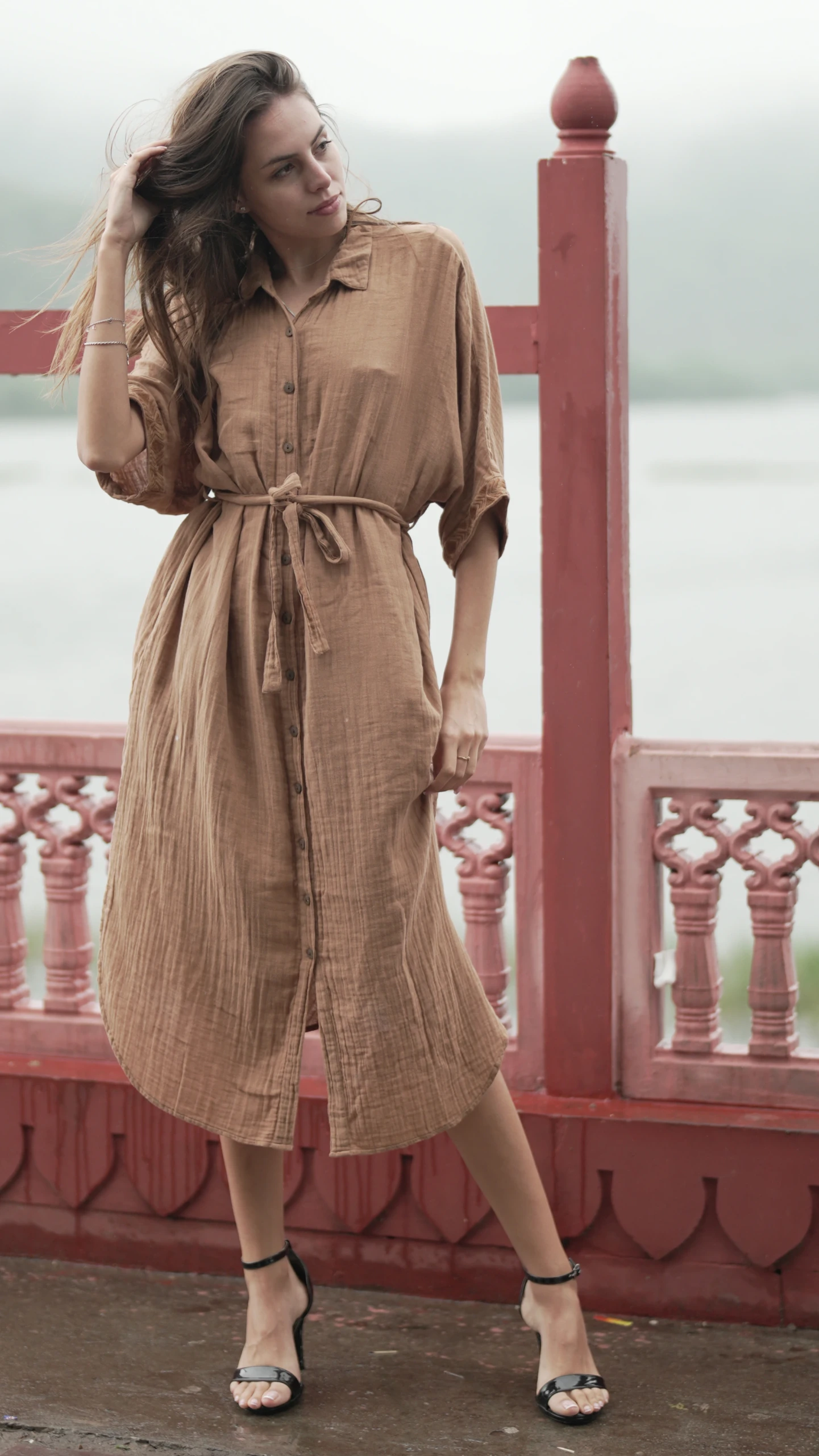 FEATURES- Soft fabrication, V-neckline with mao collar detail, long bell sleeves with fringe lace detailing at the ends, tiered skirt, drop-waist silhouette, button-up closure, pleated yoke on the bust.