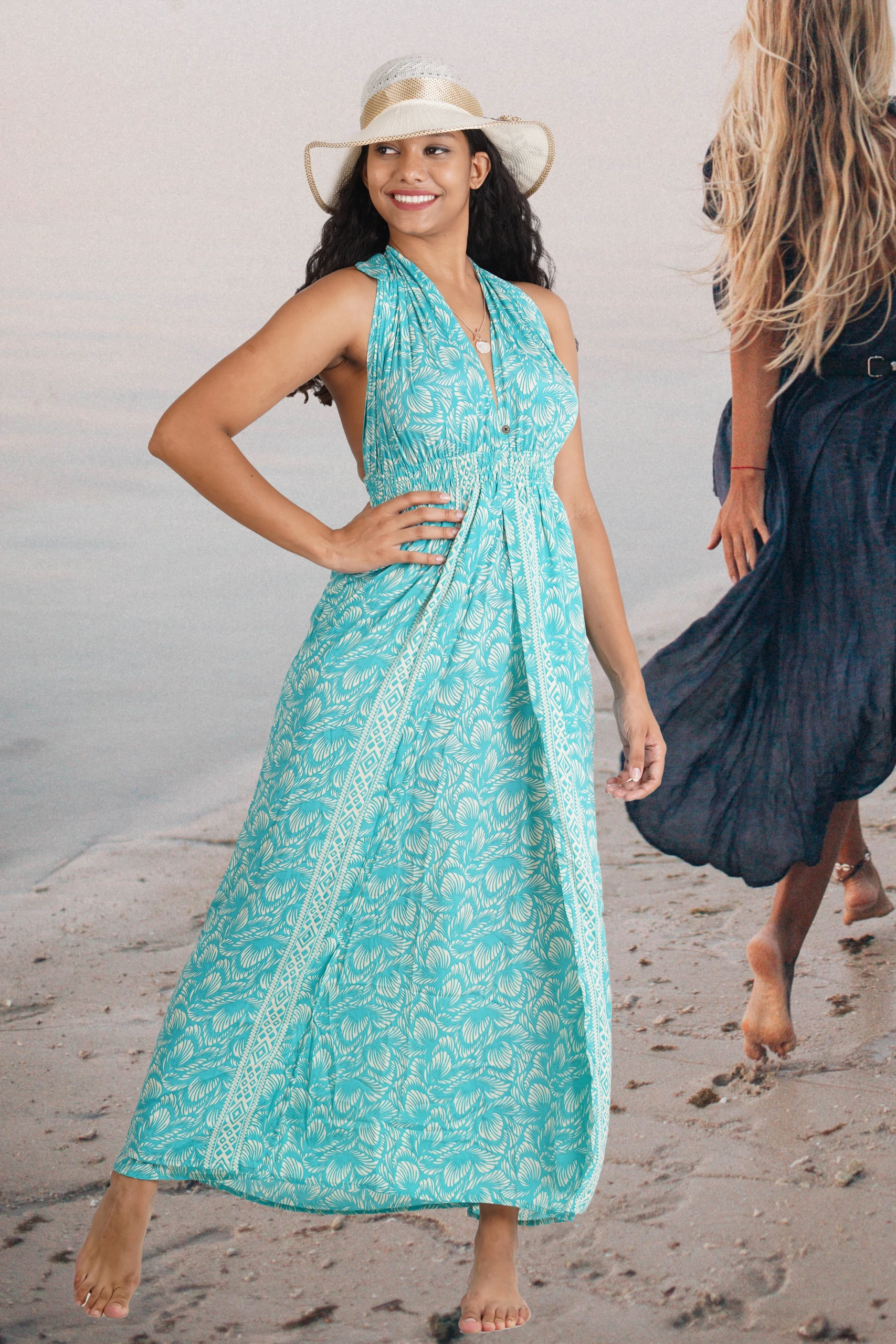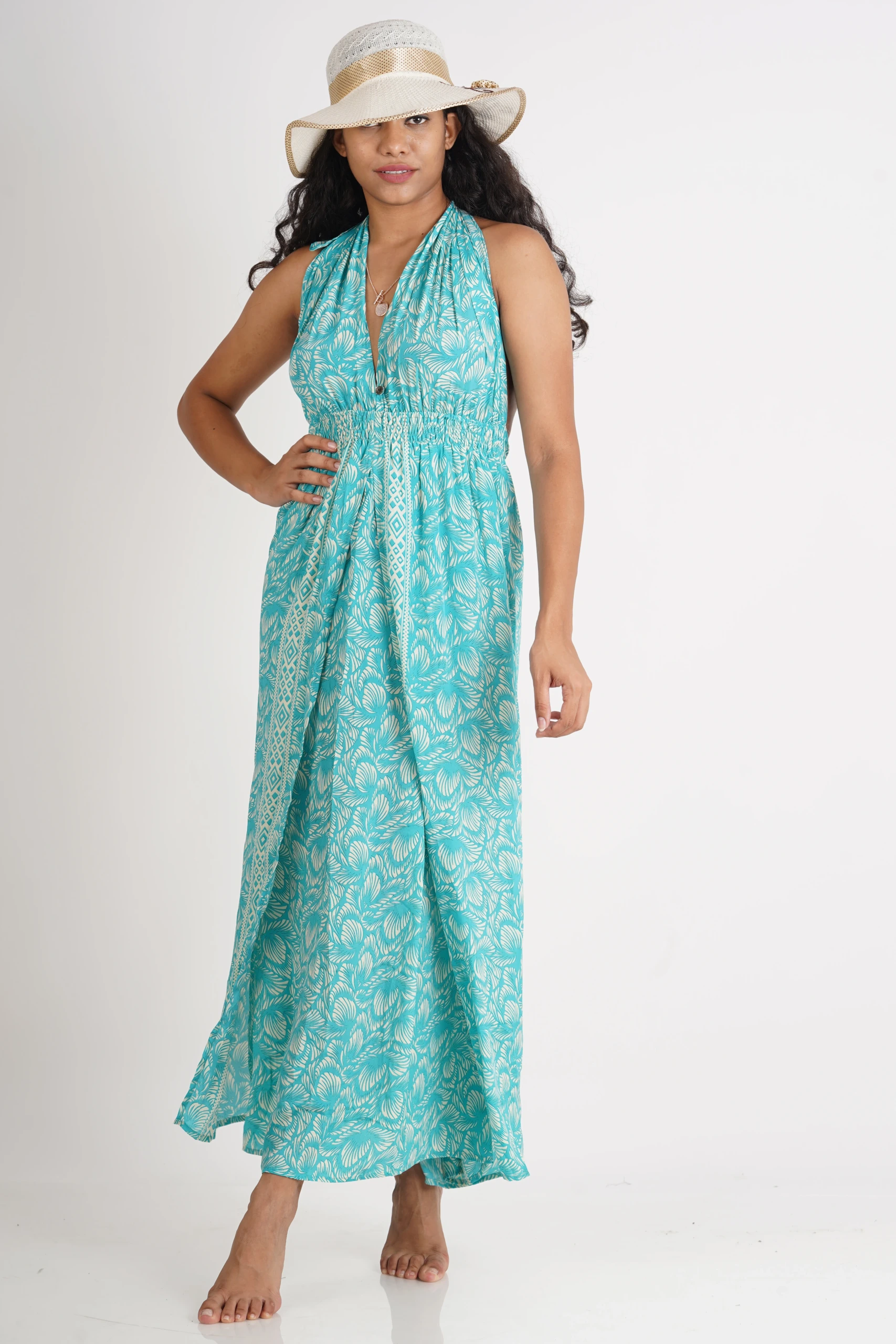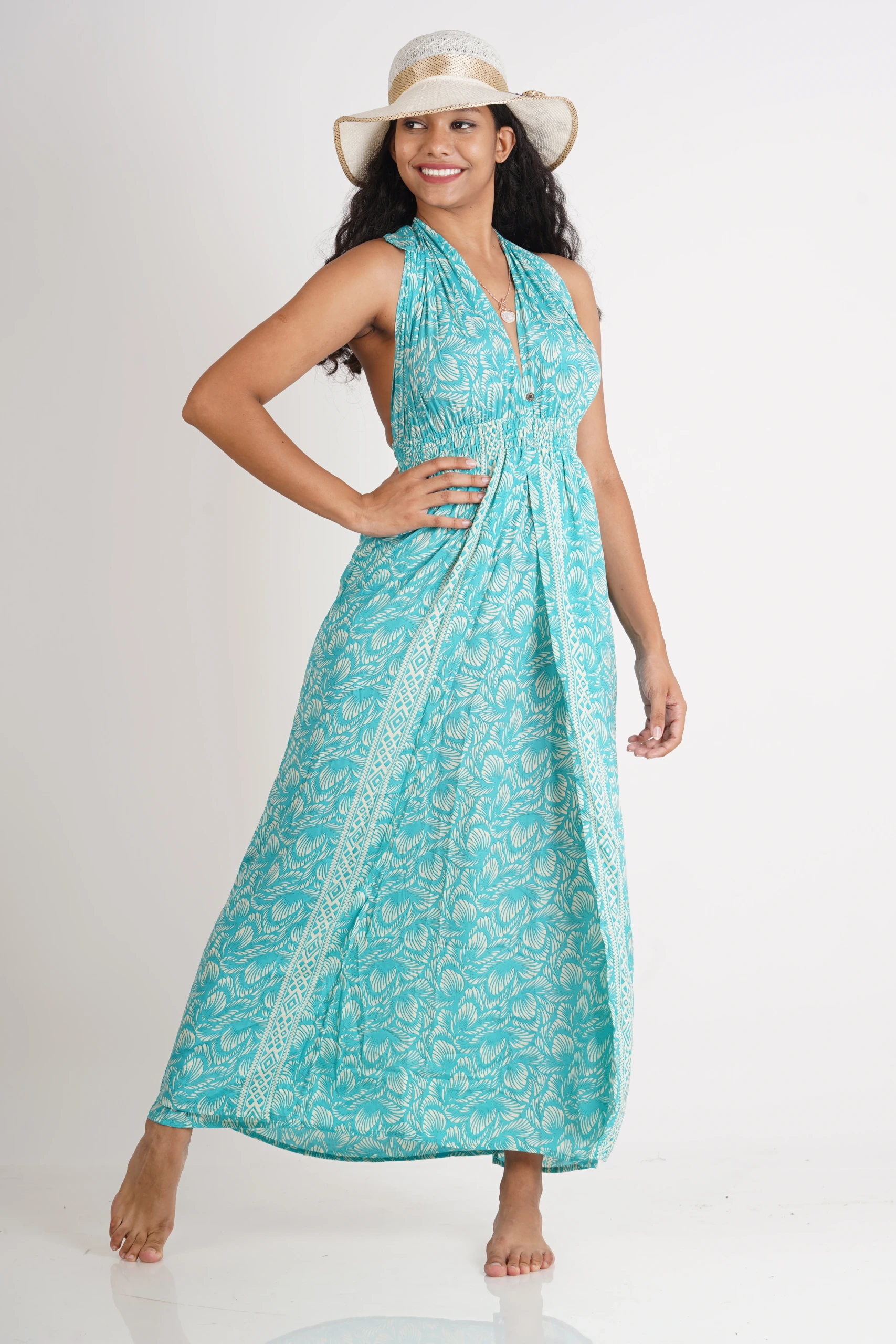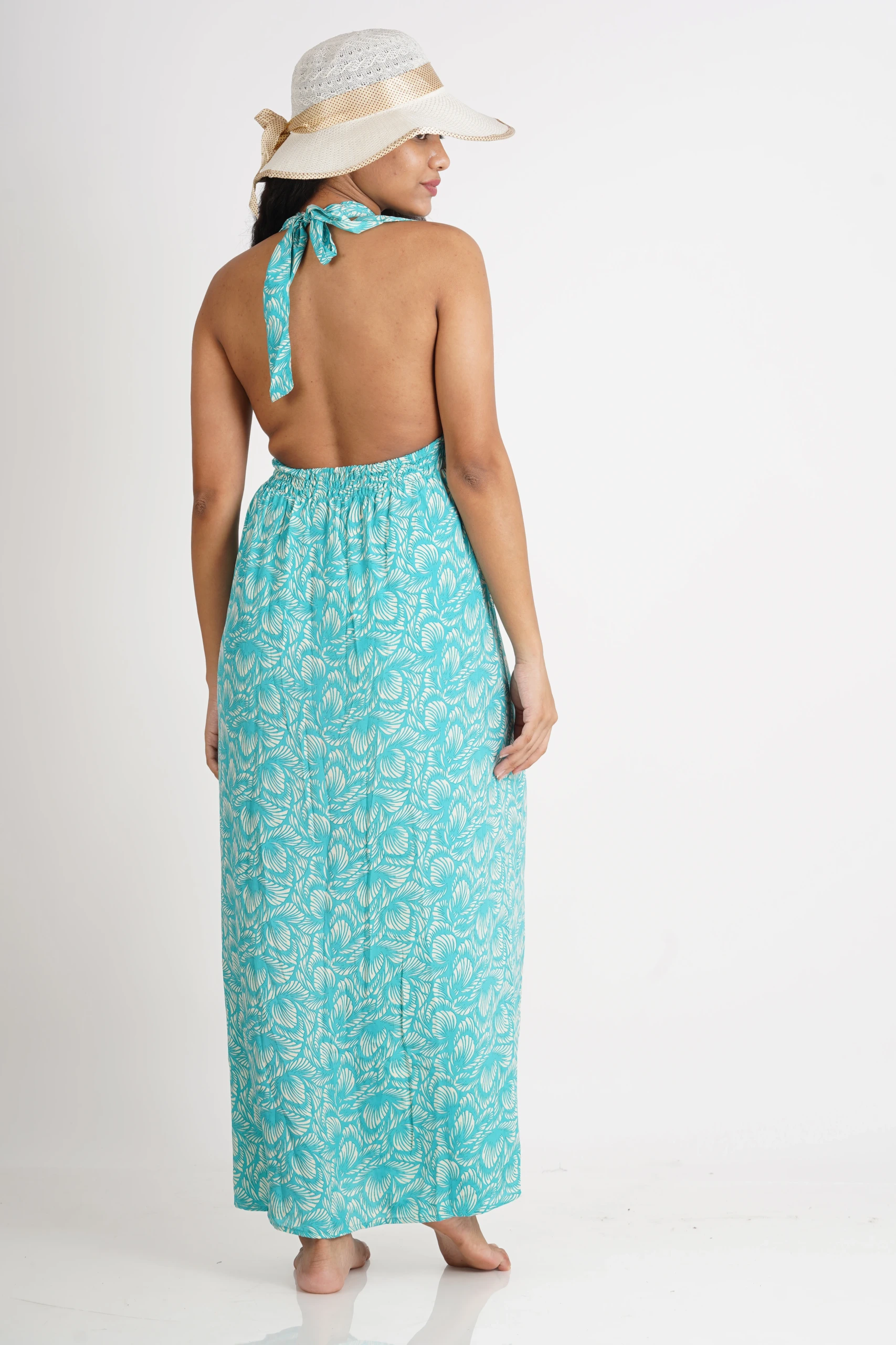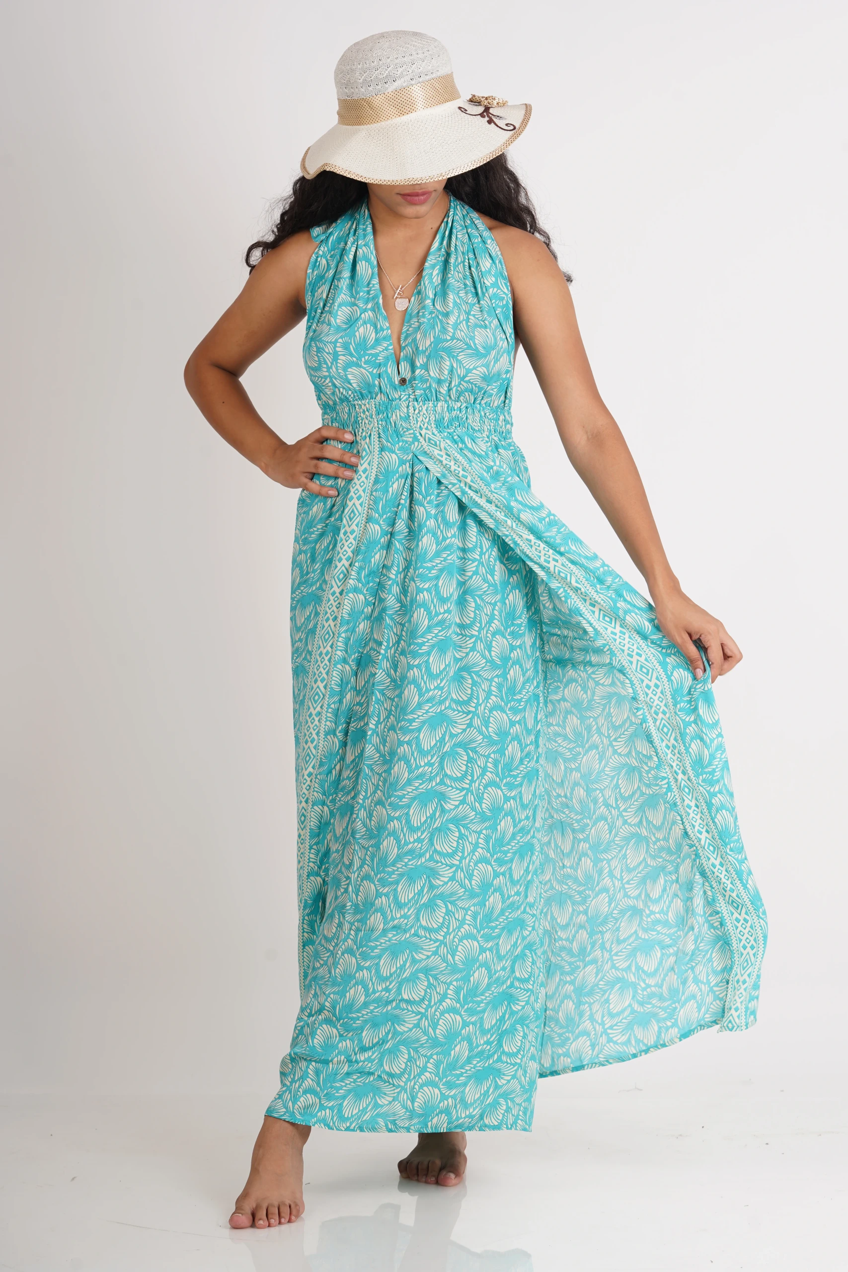 FEATURES- Plunge neckline, double layered skirt design, low back, tie-back halter closure, smocking at the back.