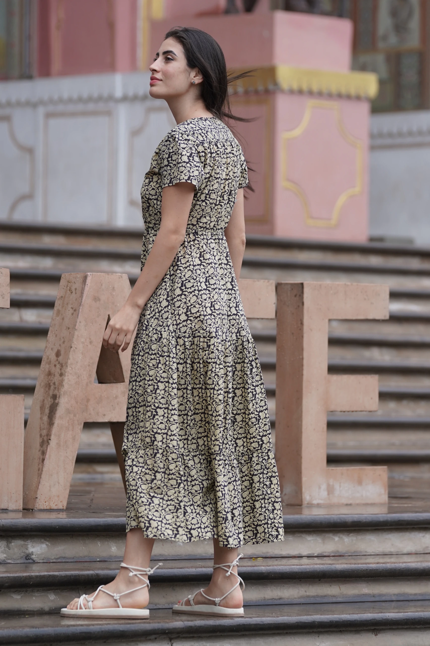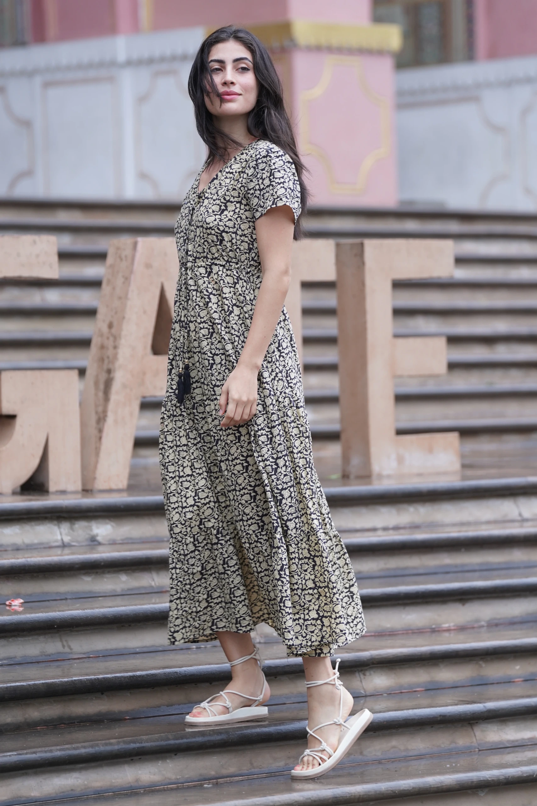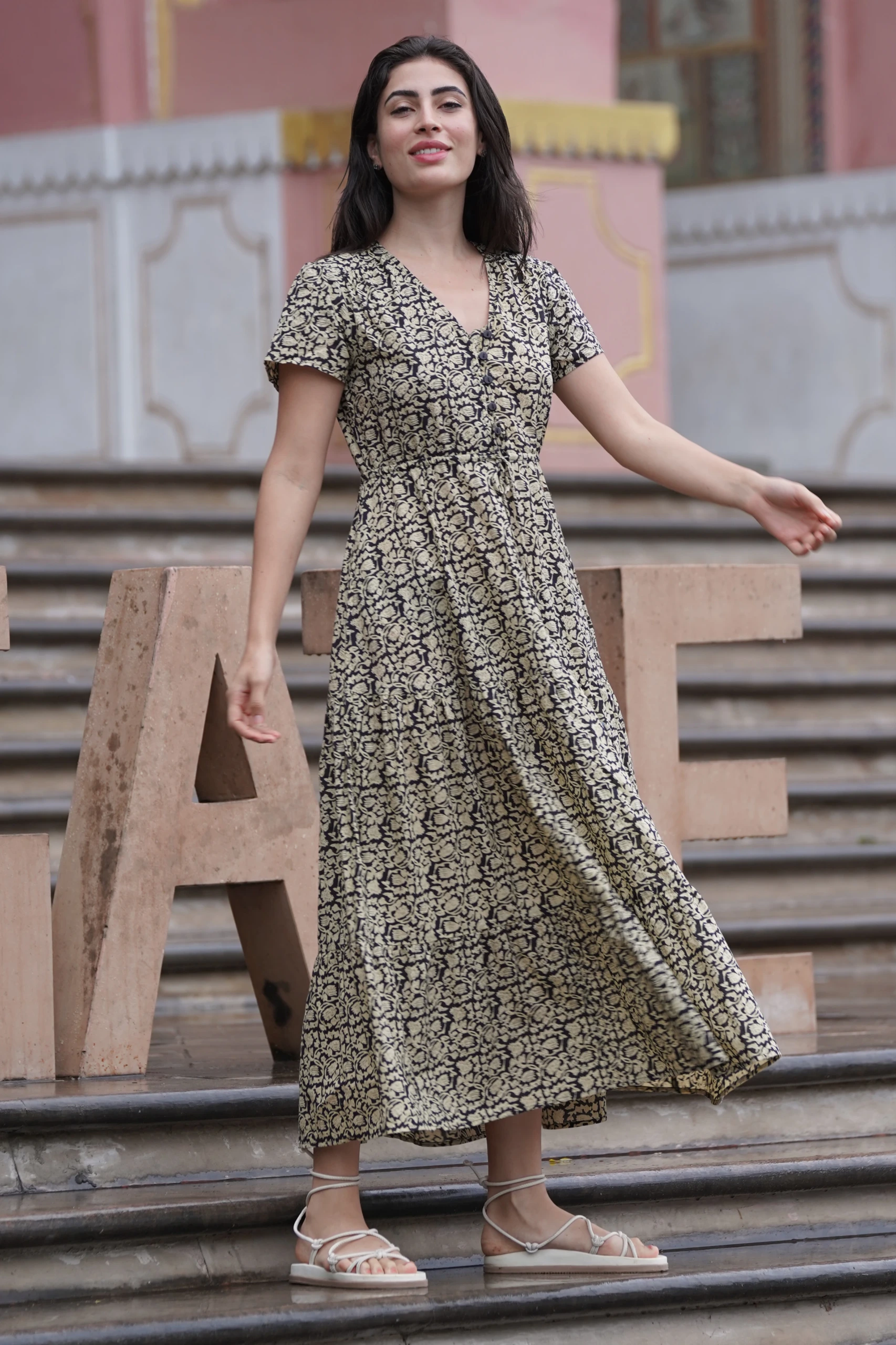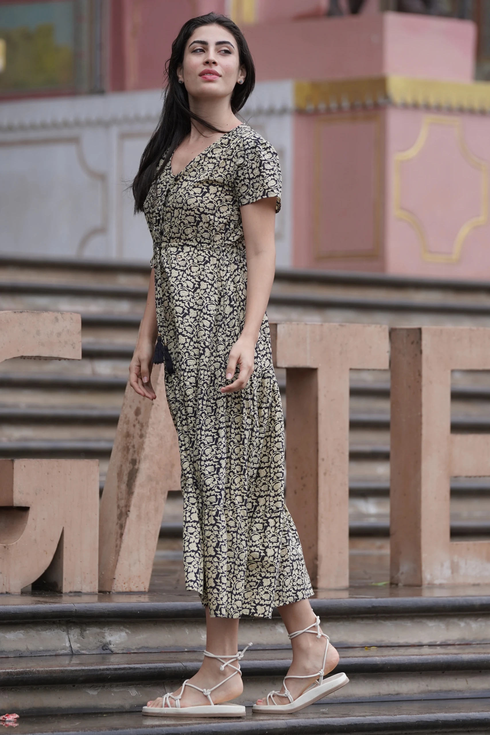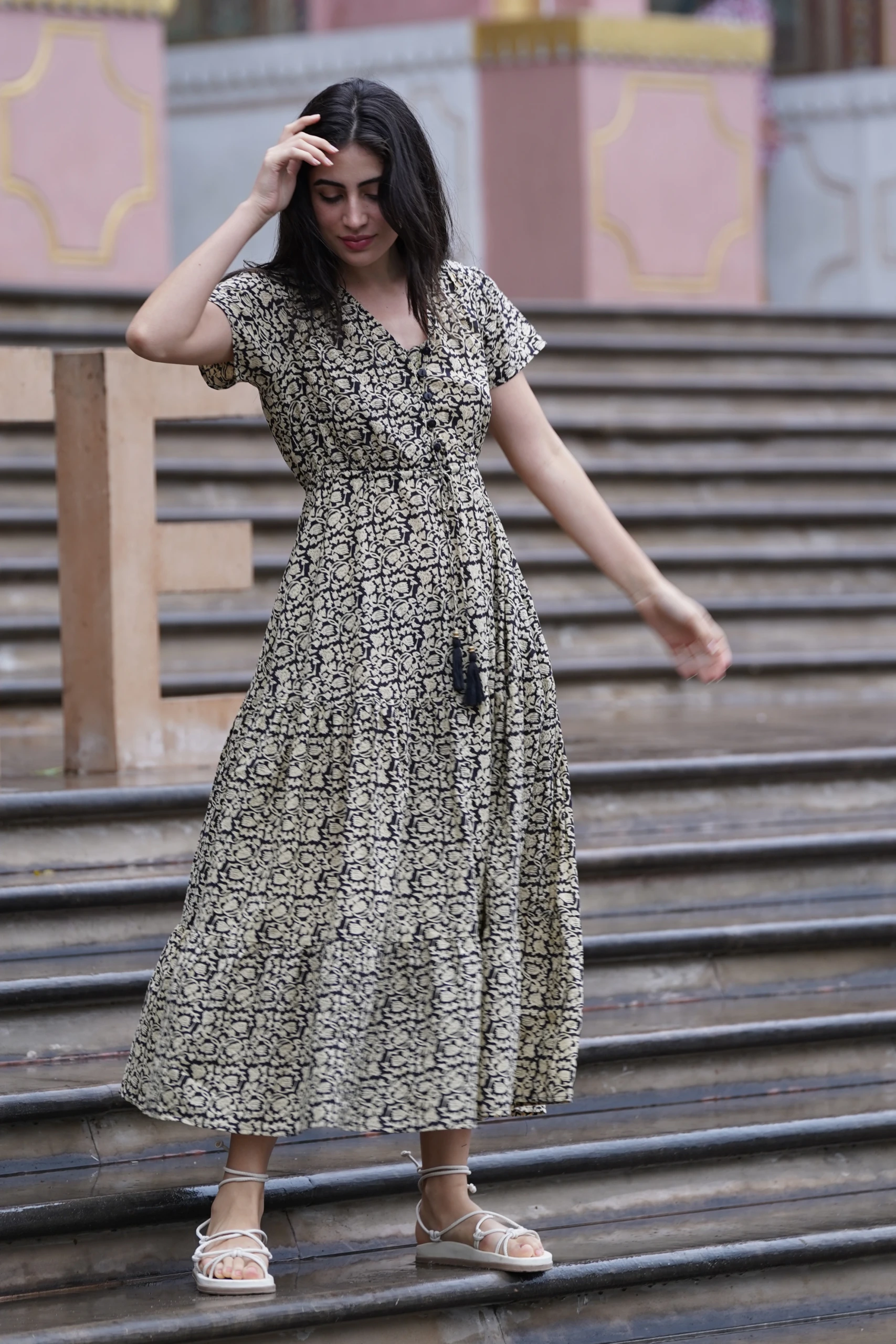 FEATURES- Block print cotton with lightweight feel, V-neckline with button-up closure, cap sleeves, elastica dn pulling string underbust, tiered hemline, side pockets.