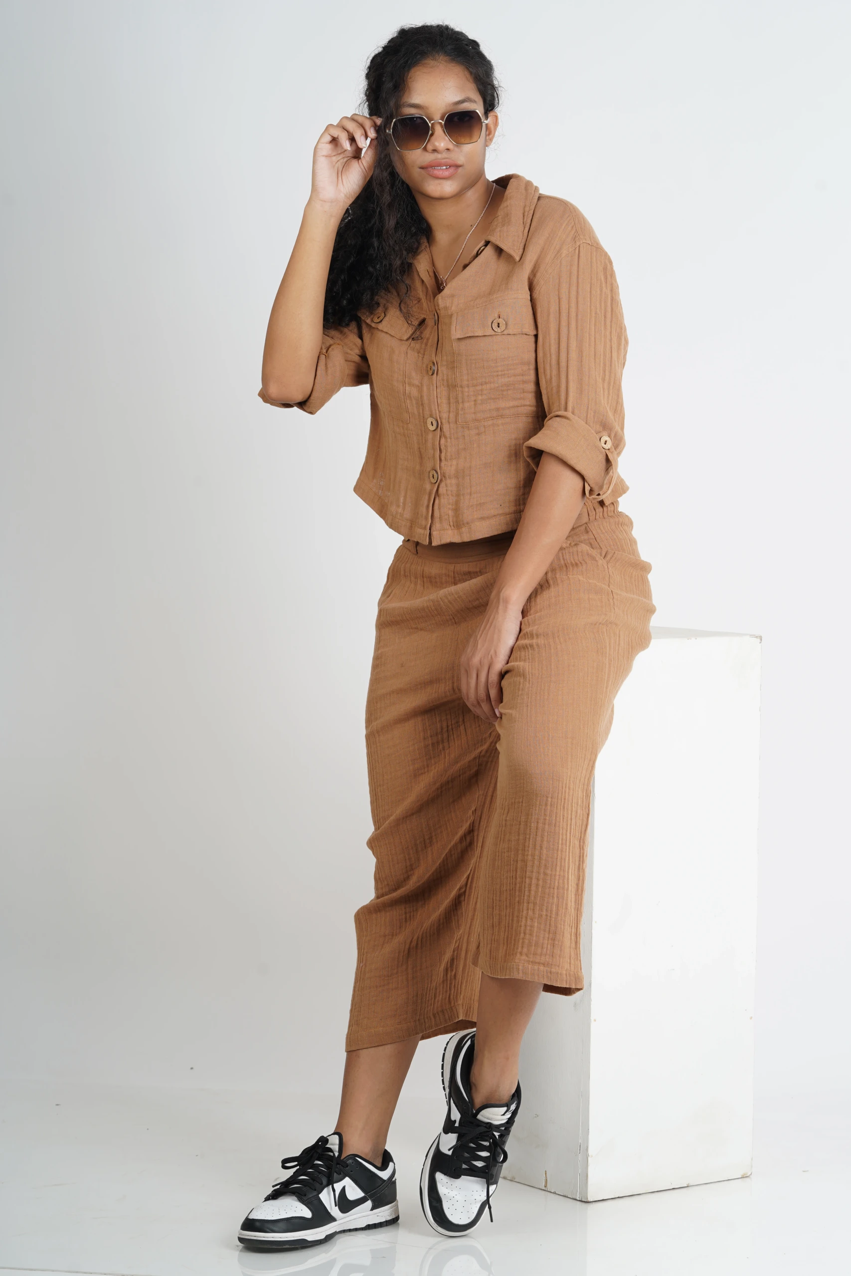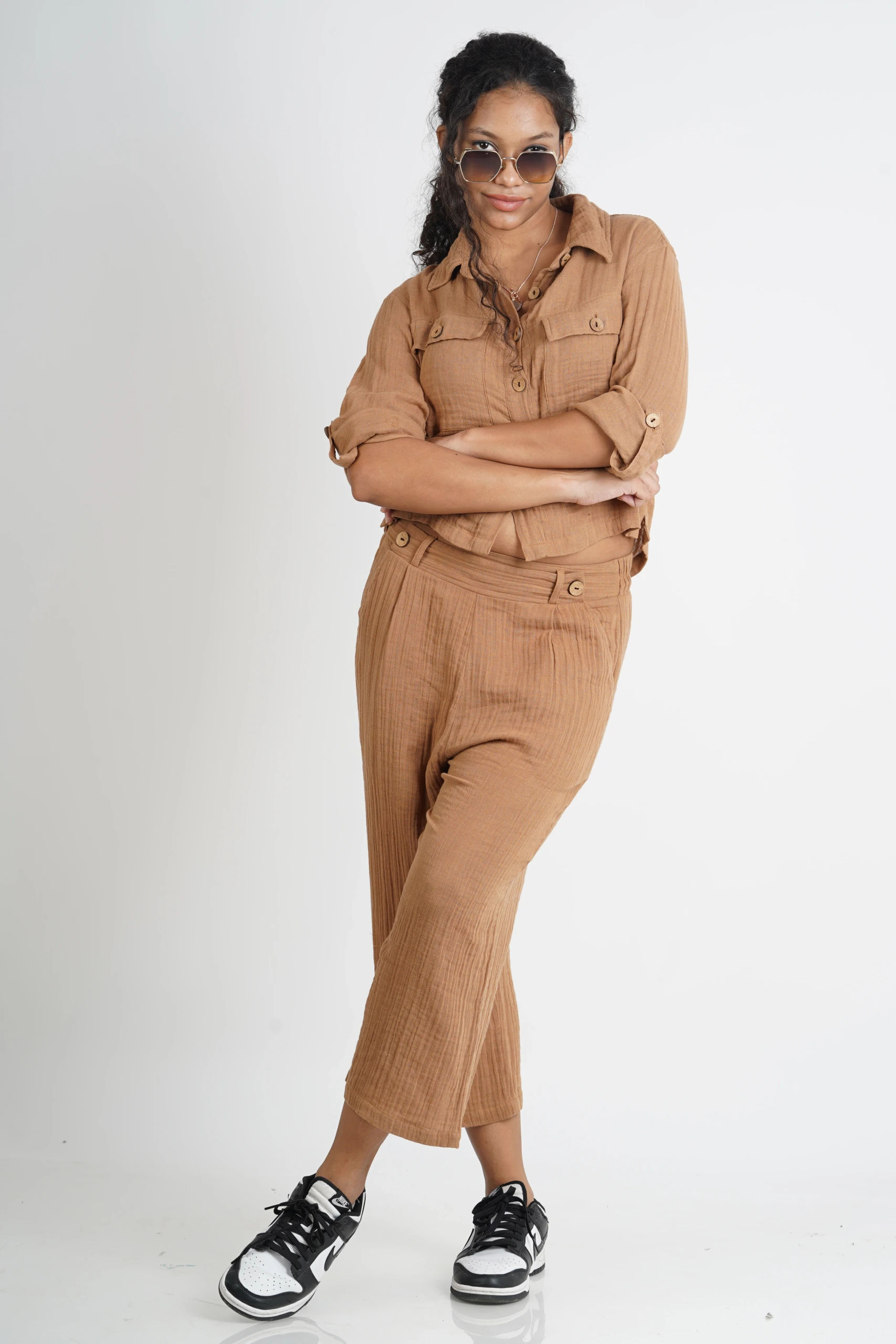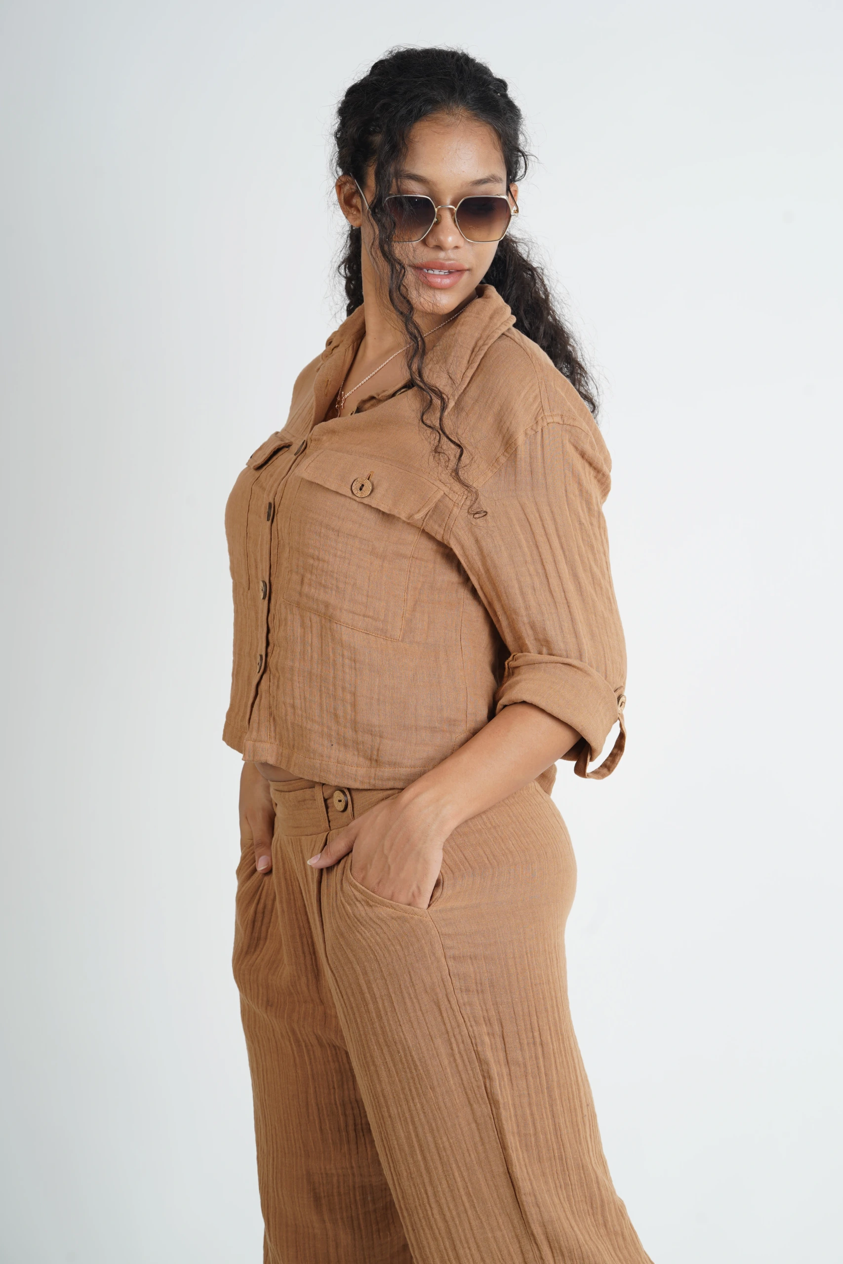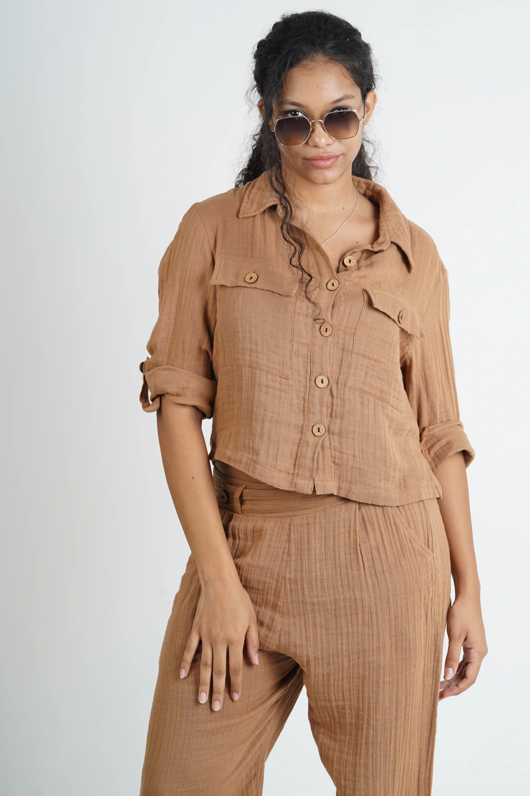 FEATURES- Top : collared neckline, long sleeves with cuff, button-down style, chest-pocket detailing with flap, side slits ; Pant : plaering on top, pull-on design with smoked waist at the back and flapped button in the front for extra detail, side pockets.