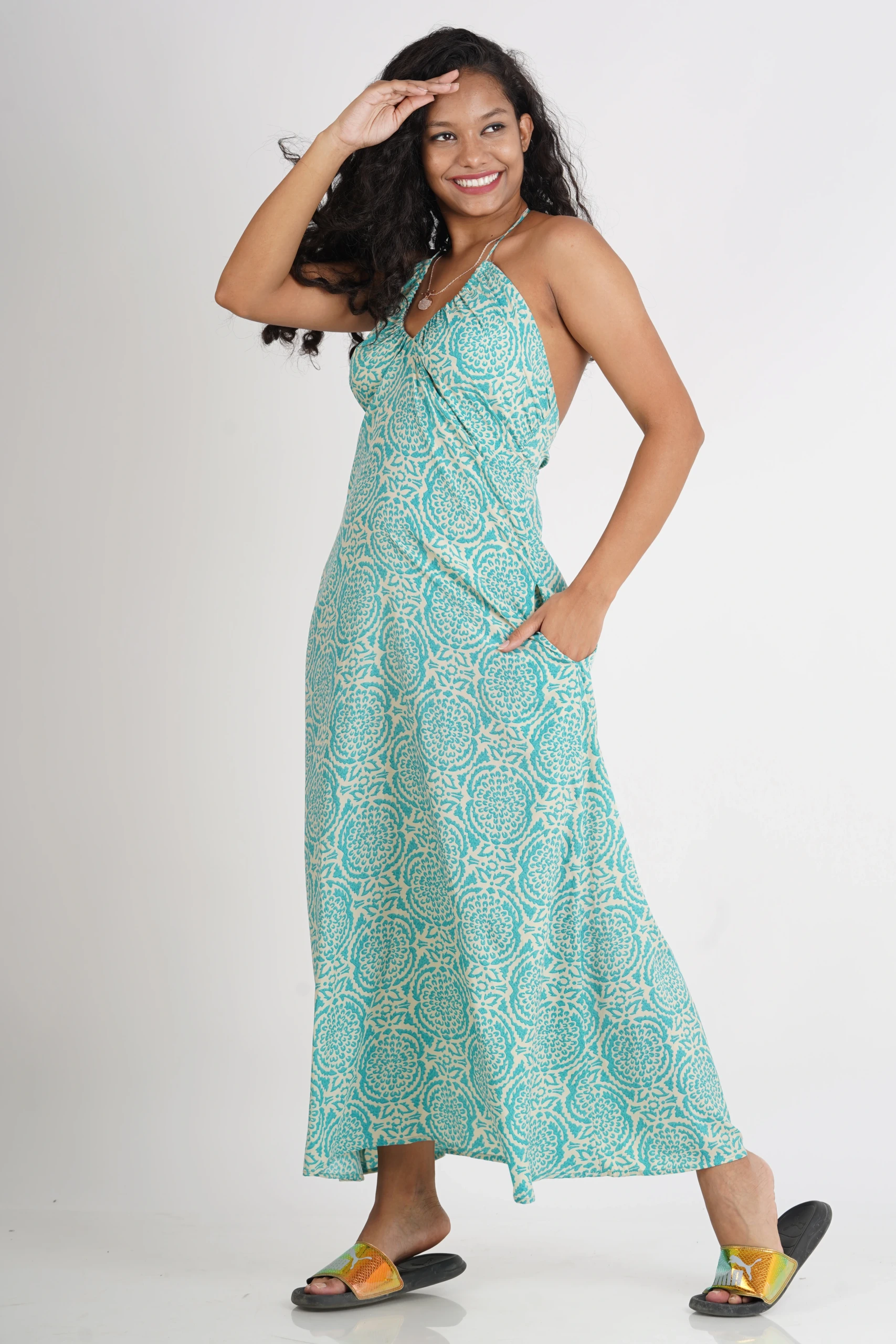 FEATURES- Halter-neckline with adjustable tie in the neck, dropped shoulders, exposed tie-adorned back, side-pockets.