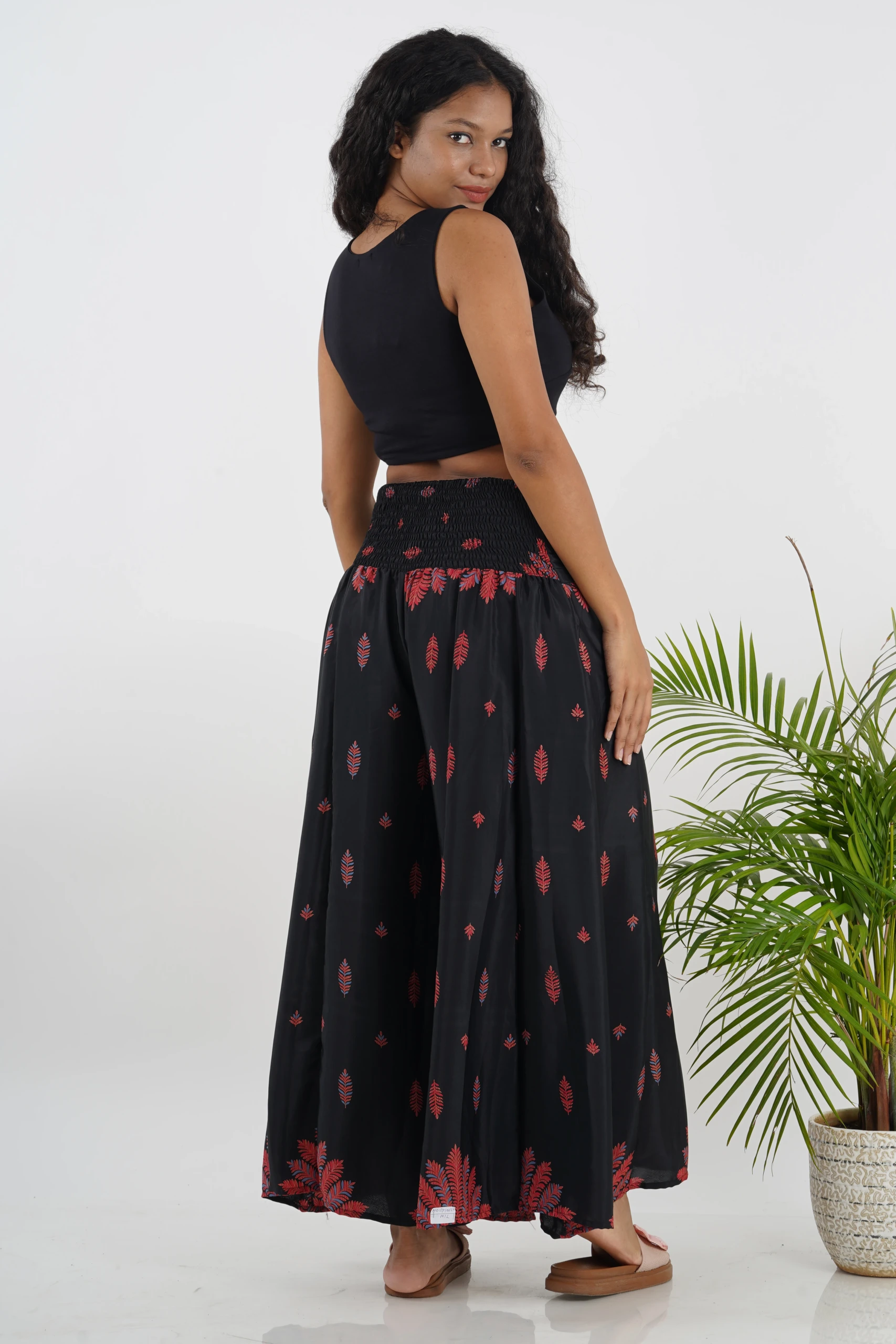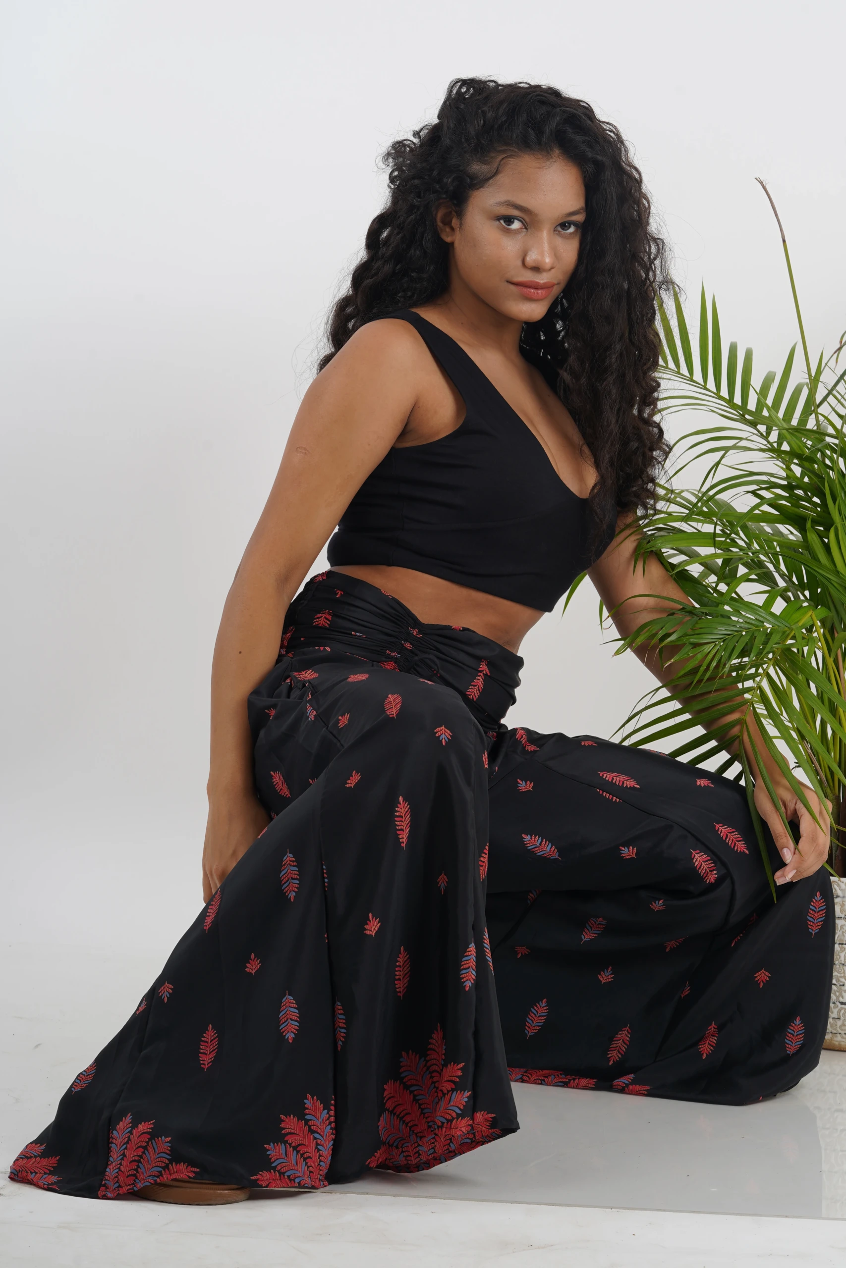 FEATURES- Top : wrap-tie, ruffled bell sleeves with 3/4 length ; Trouser : vertical pannled design, wide waistband with smoke at the back & pleated details in the front along with a string to adjust the belt width, pull-on design .
