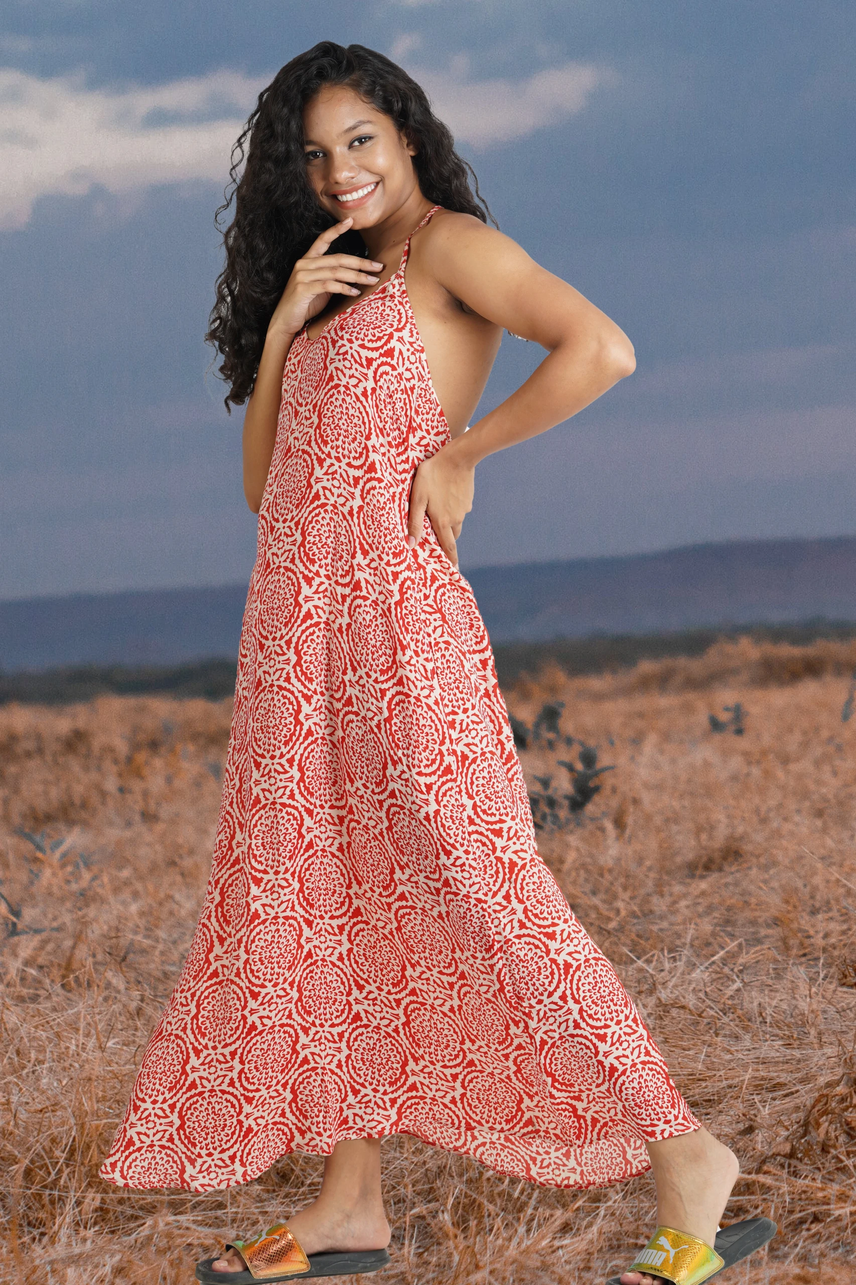 FEATURES- Halter V-neckline, open back with adjustable racer back strap, swingy hemline, dropped armholes.