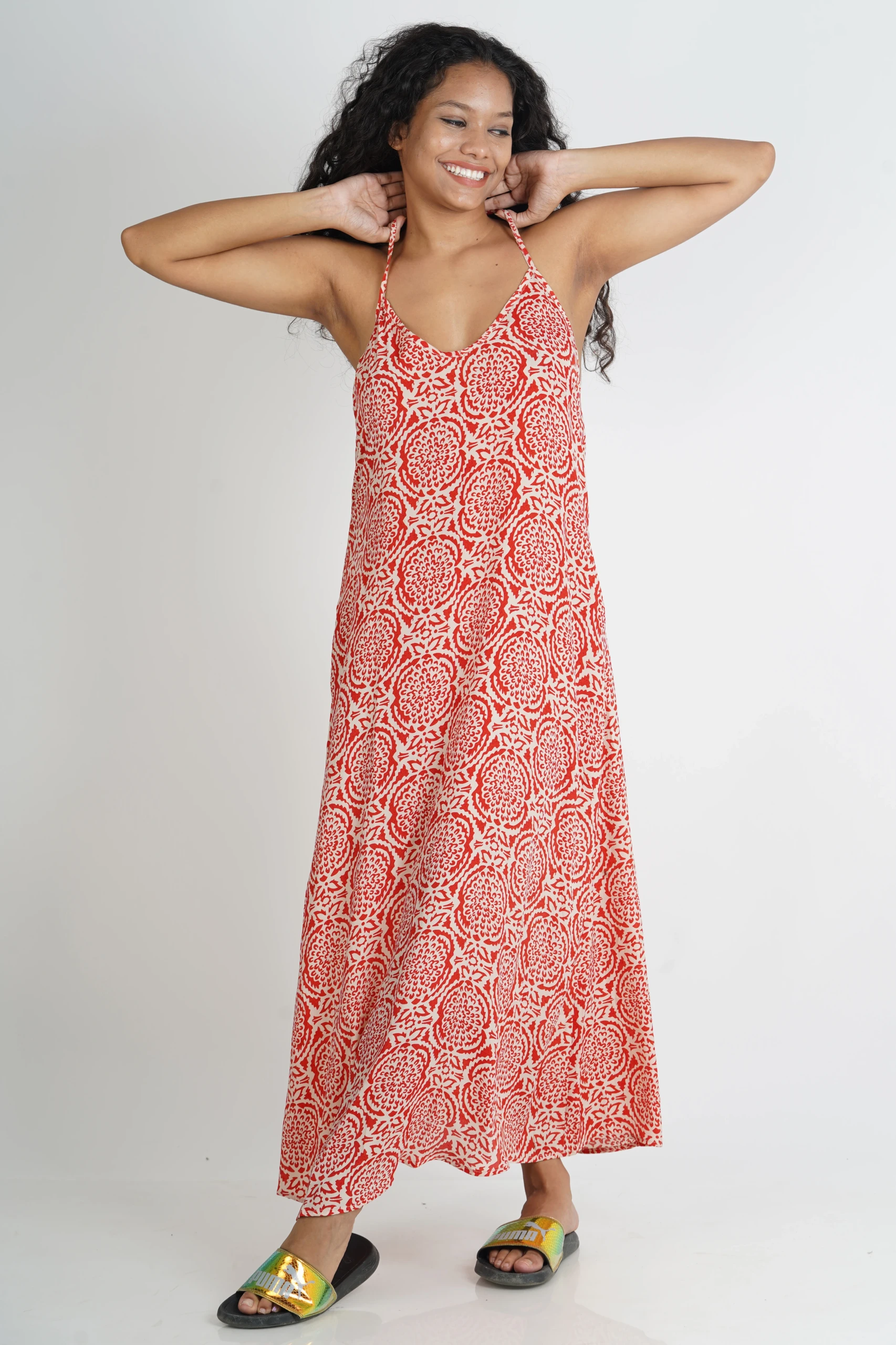 So effortlessly cool, this flattering maxi is featured in a soft silk sari fabrication and sleeveless silhouette with an adjustable racerback strap.