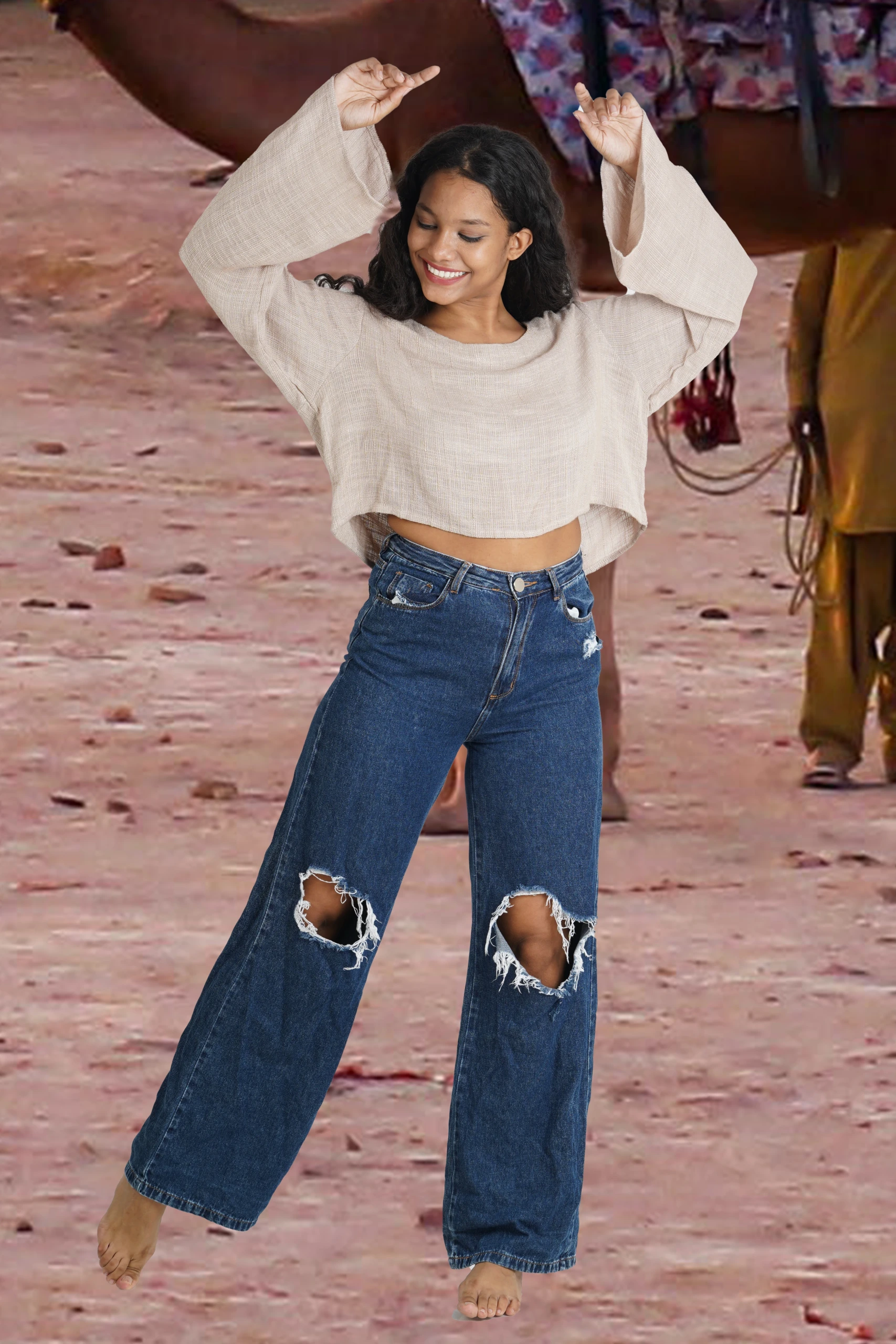 FIT- Slouchy, relaxed fit, slightly cropped.