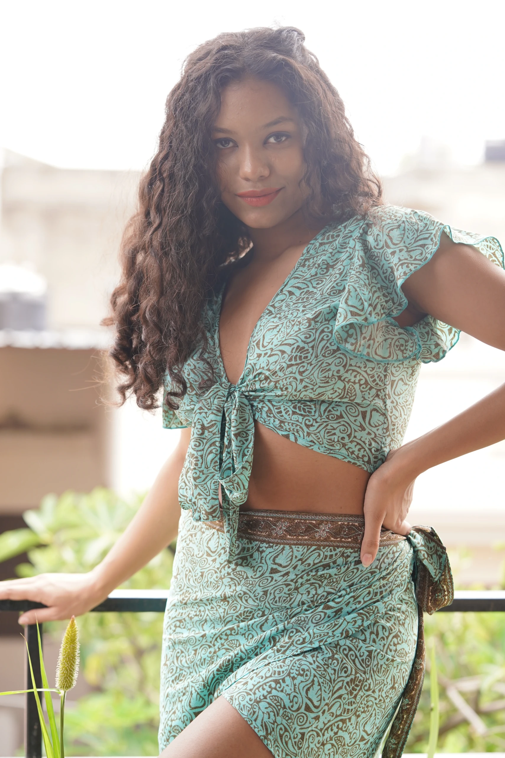 Made for a sunny day in the city or on the beach, this sweet set features a ruffled wrap top and matching high-rise shorts in a soft silk sari fabrication.