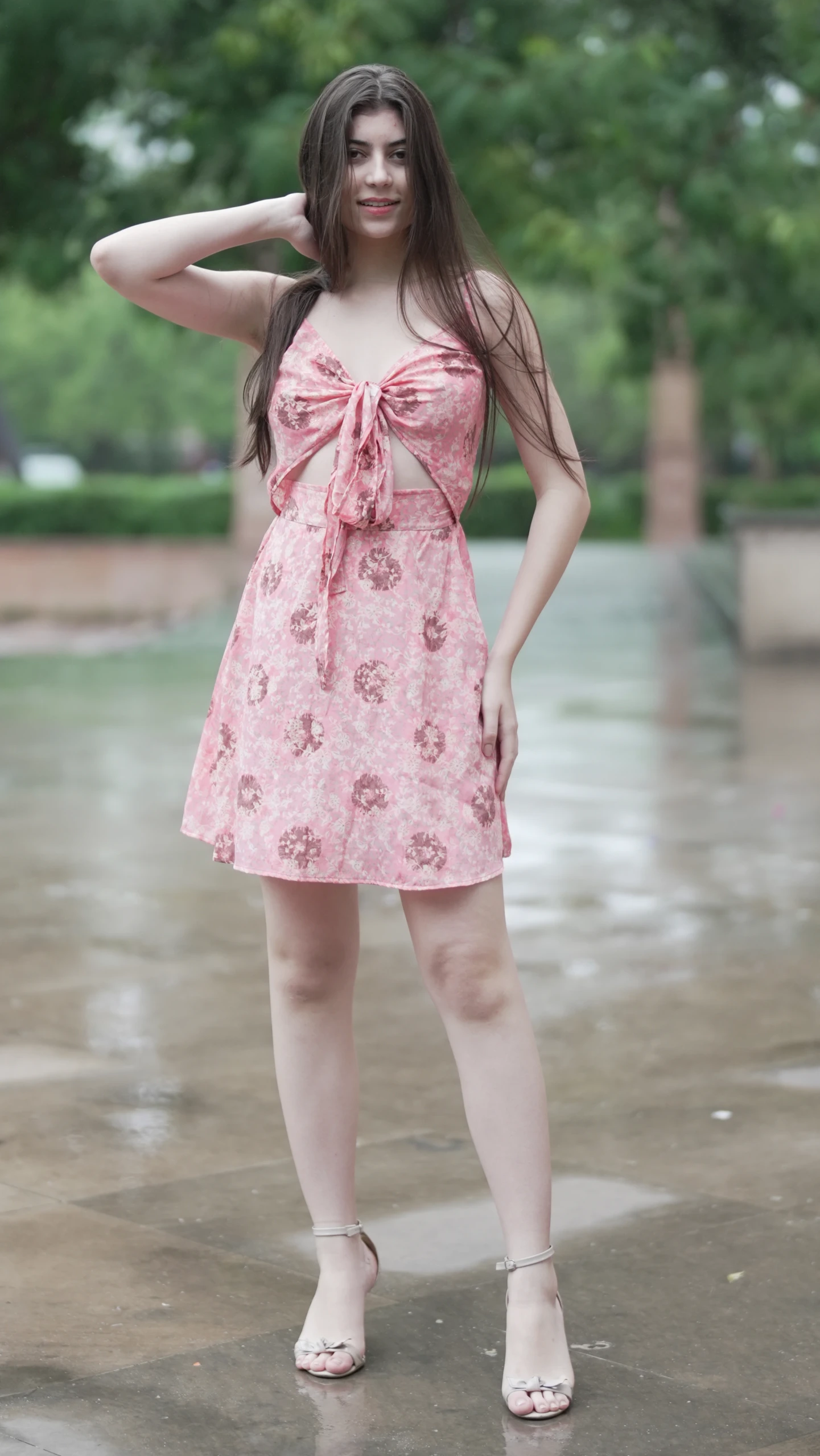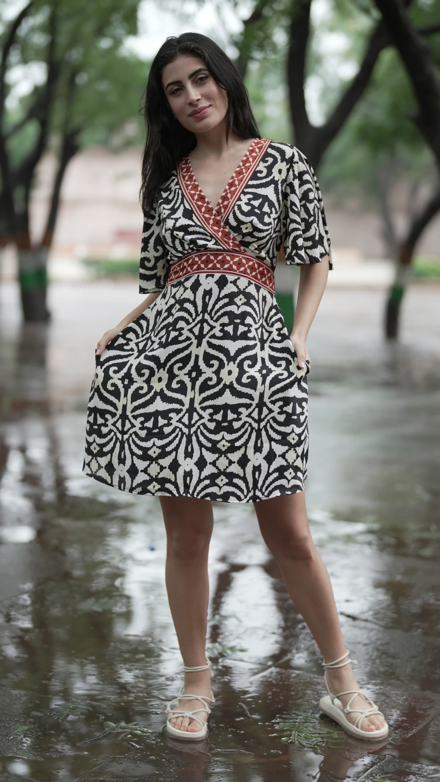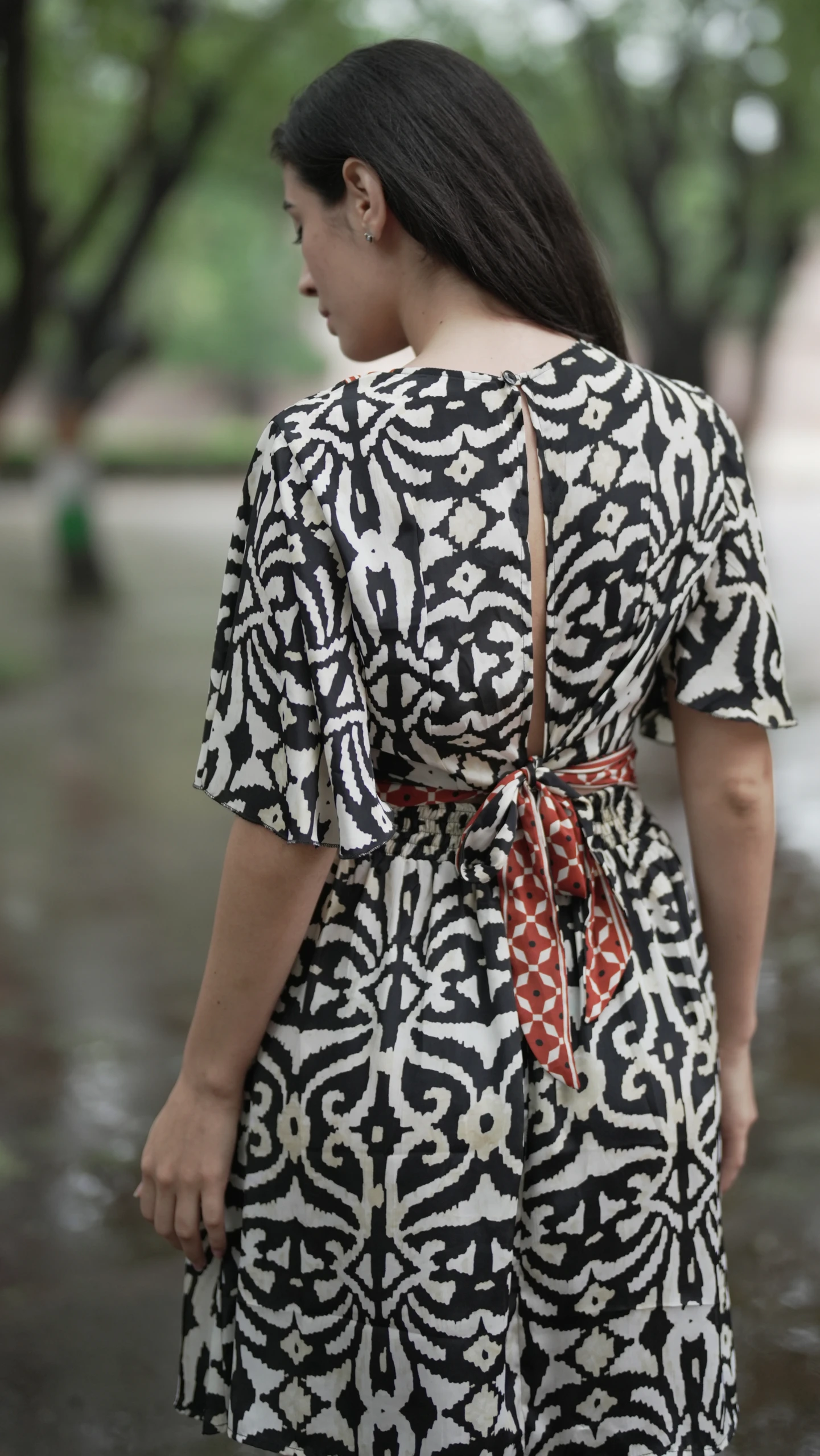 FEATURES- V-neckline, short bell sleeves, tie detailing at the back, two side pockets, smocked waistband and keyhole cutout with one button closure at the back.