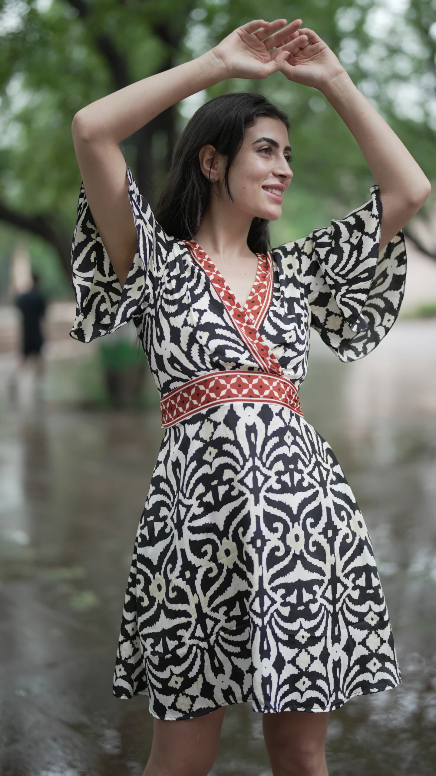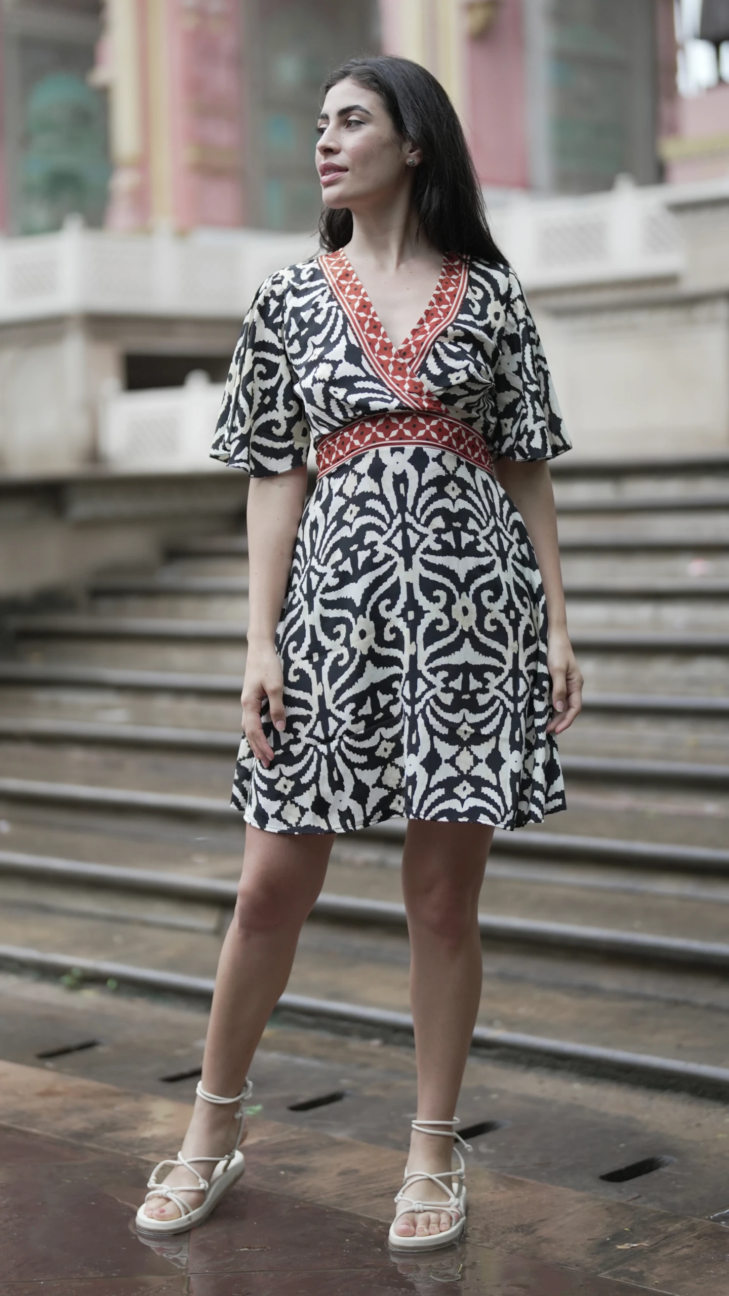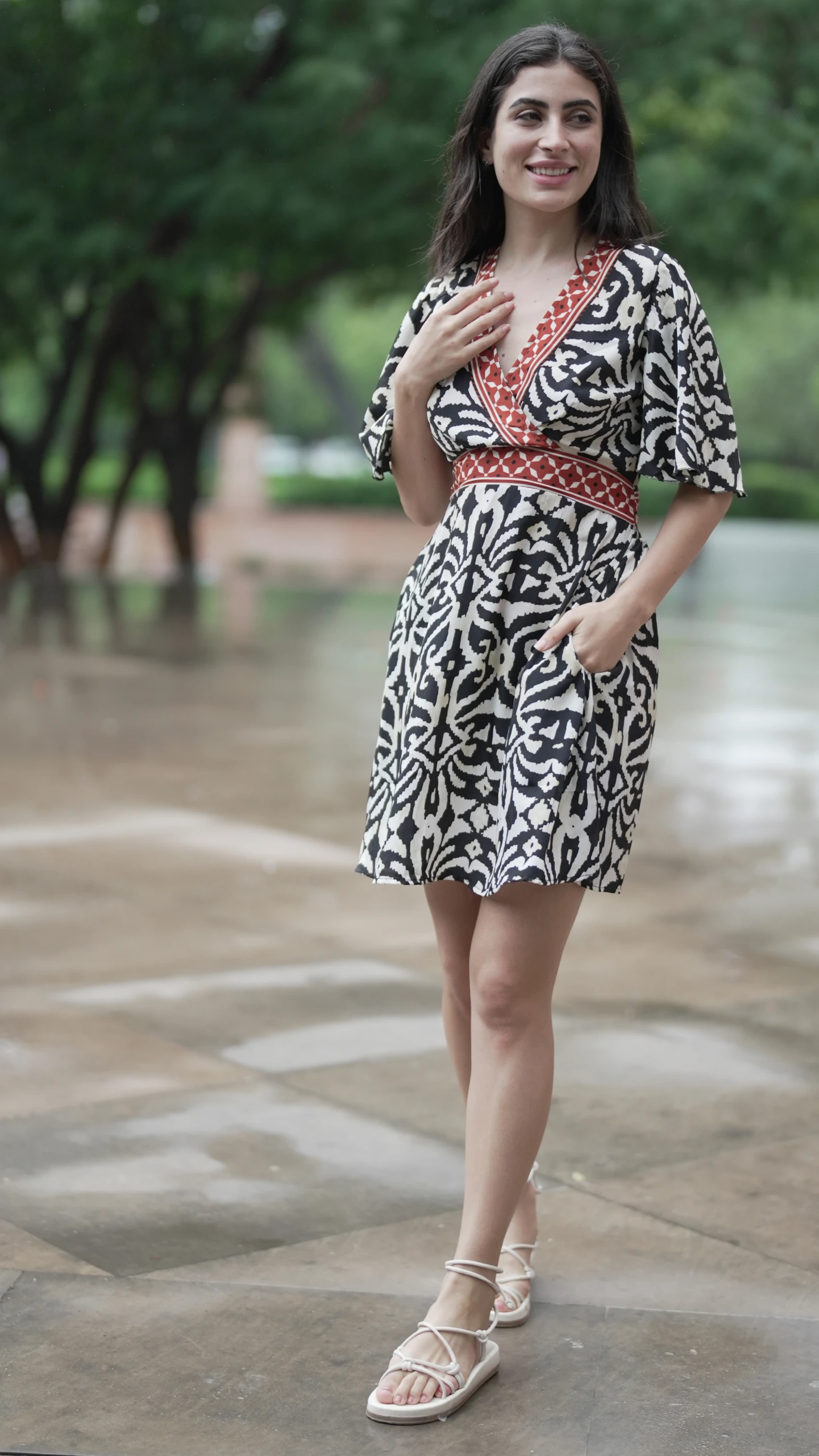 Turn heads in this so stunning mini dress featured in a silky fabrication with printed border details at the bust and waist.