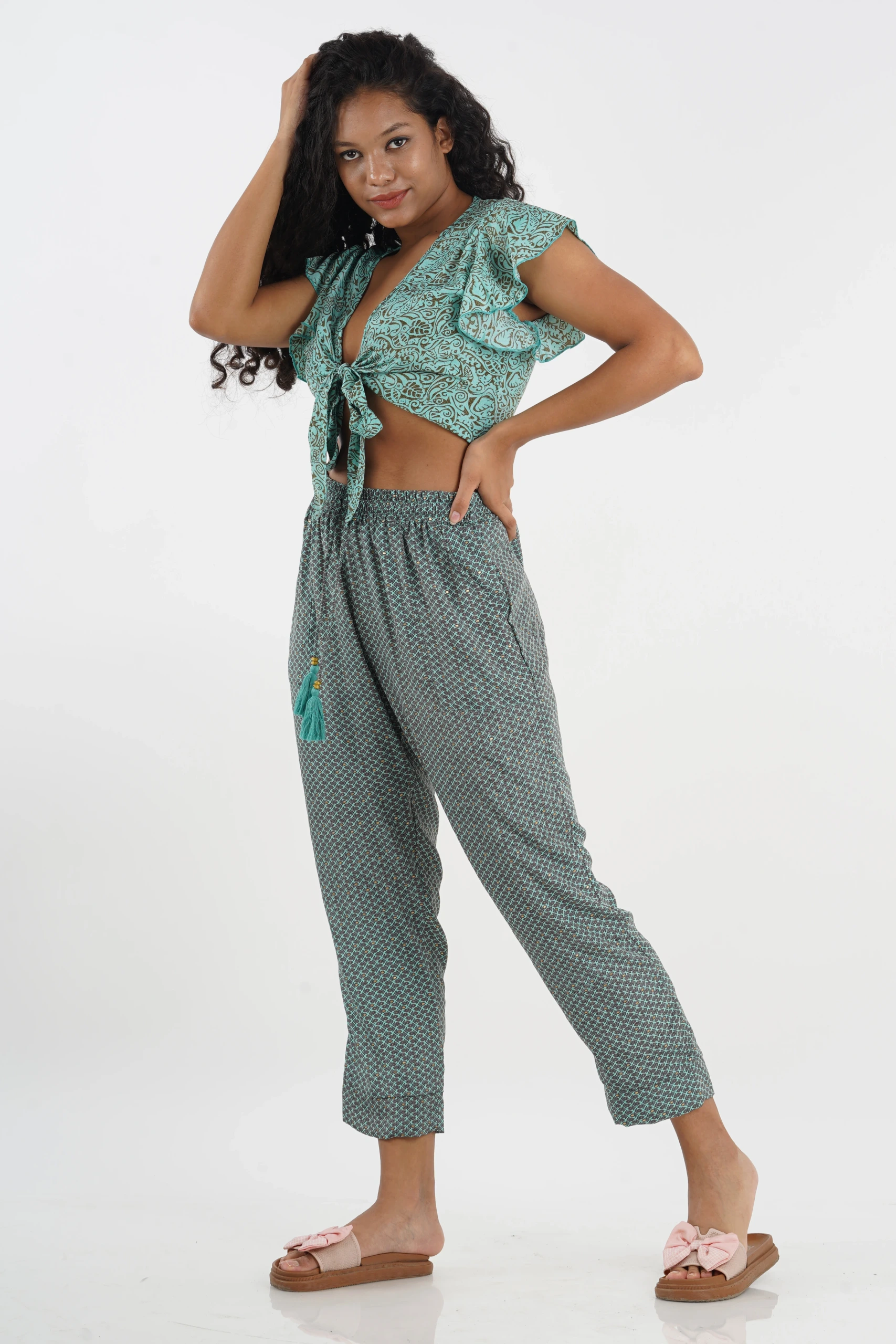 FEATURES- Drwastring feature with tussles, elasticated waistband, pull-on design, ankle length cropped, two pockets.