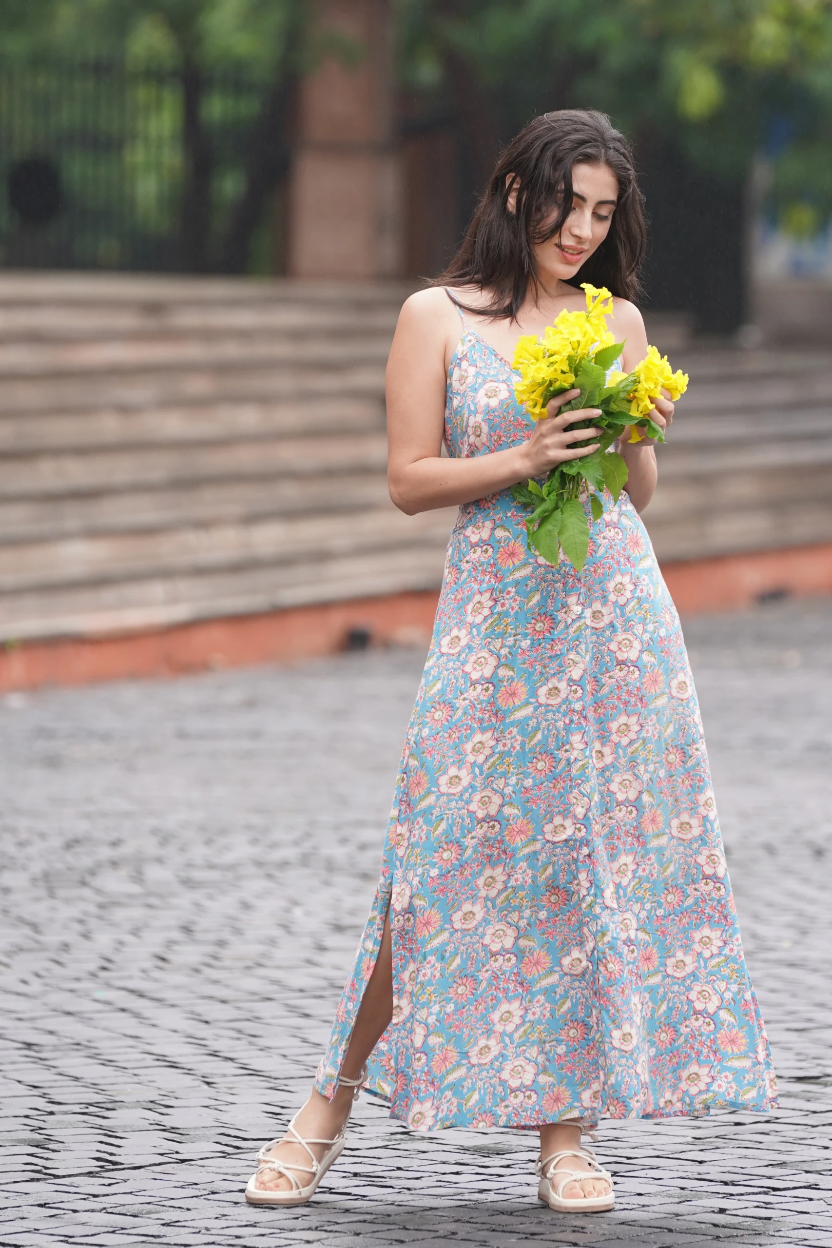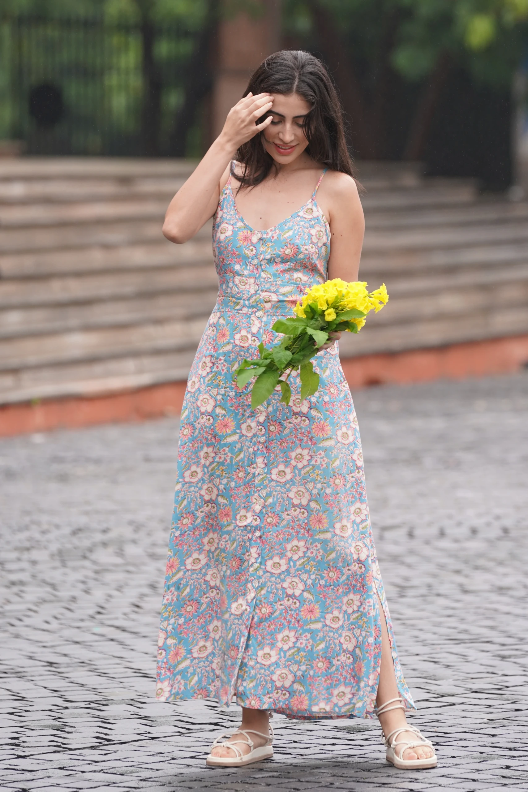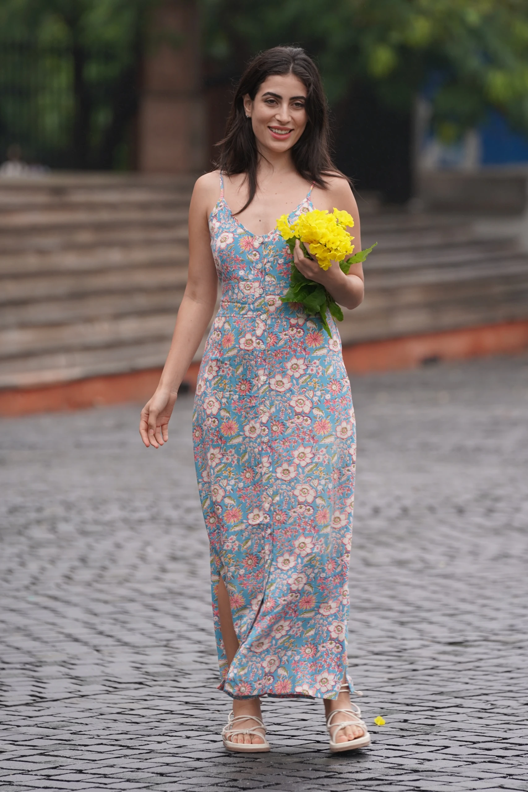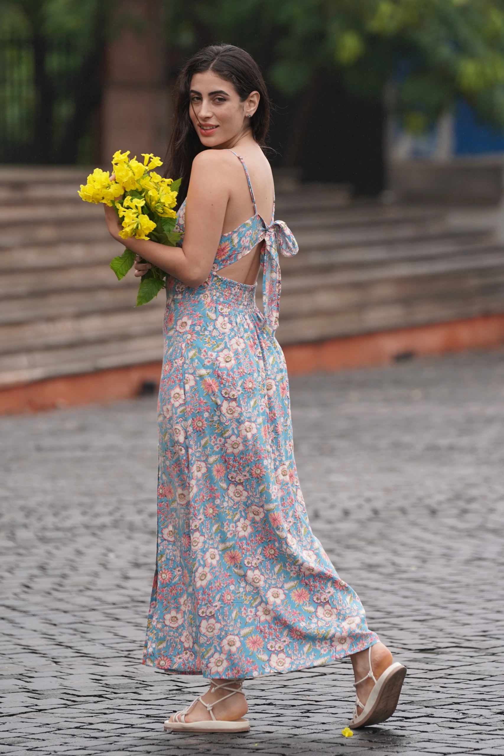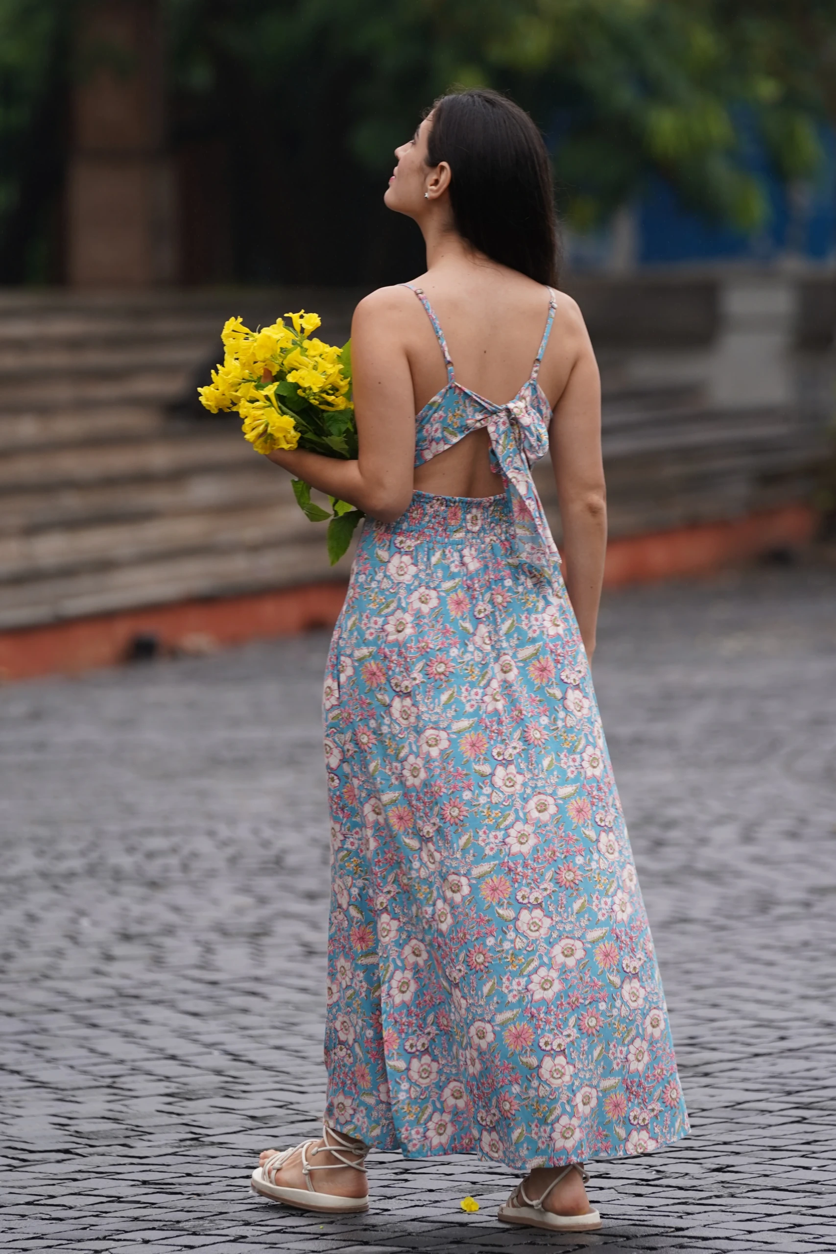 FEATURES- Beautiful block print cotton, V-neckline, adjustable shoulder straps, button-up closures, side pockets, smocking at back, side-slits, cutout back with self-tying closure.