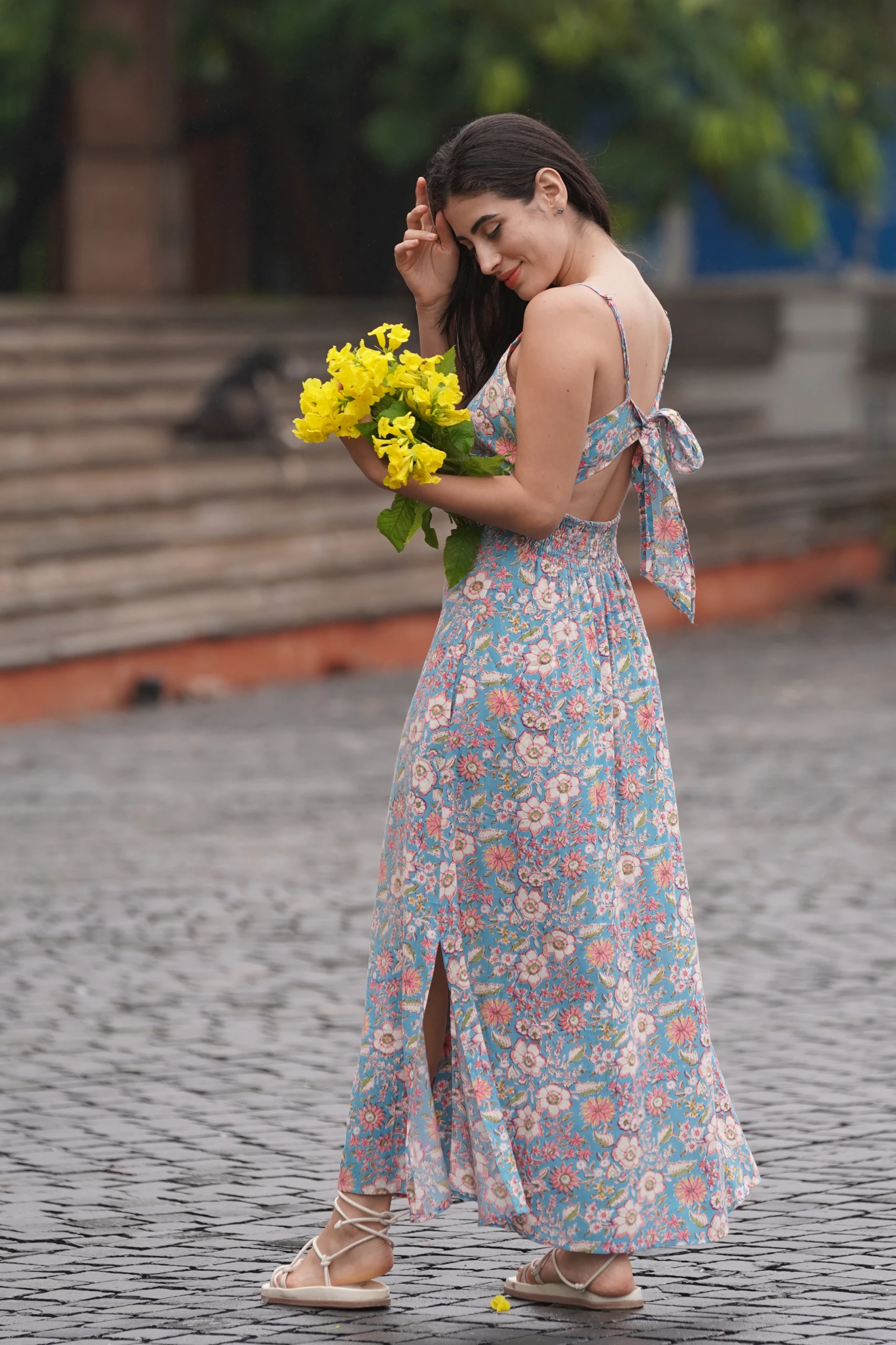 Turn heads in this timeless maxi dress featured in a femme, mixed floral print design with a sleeveless silhouette and a super exposed back for added dimension.