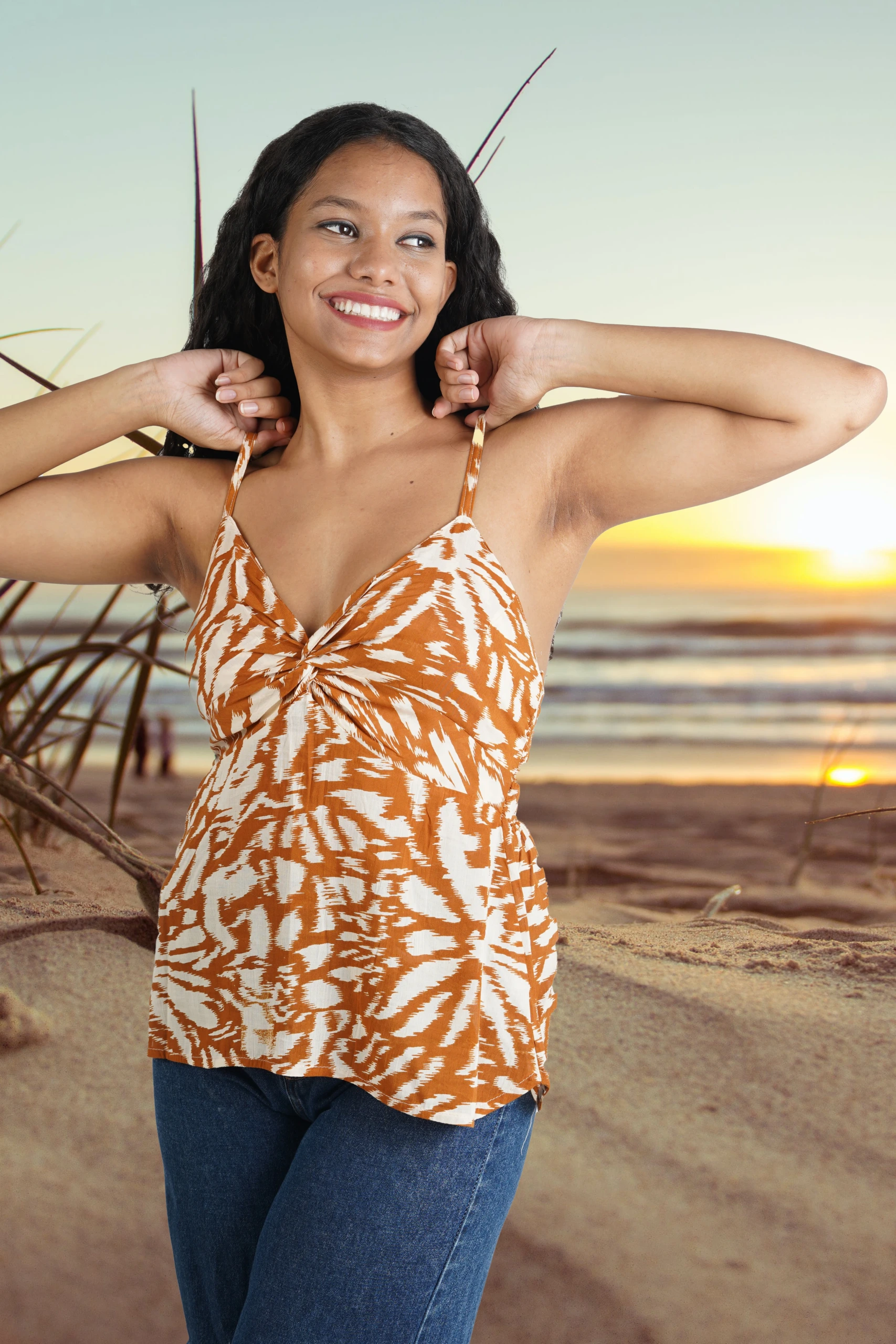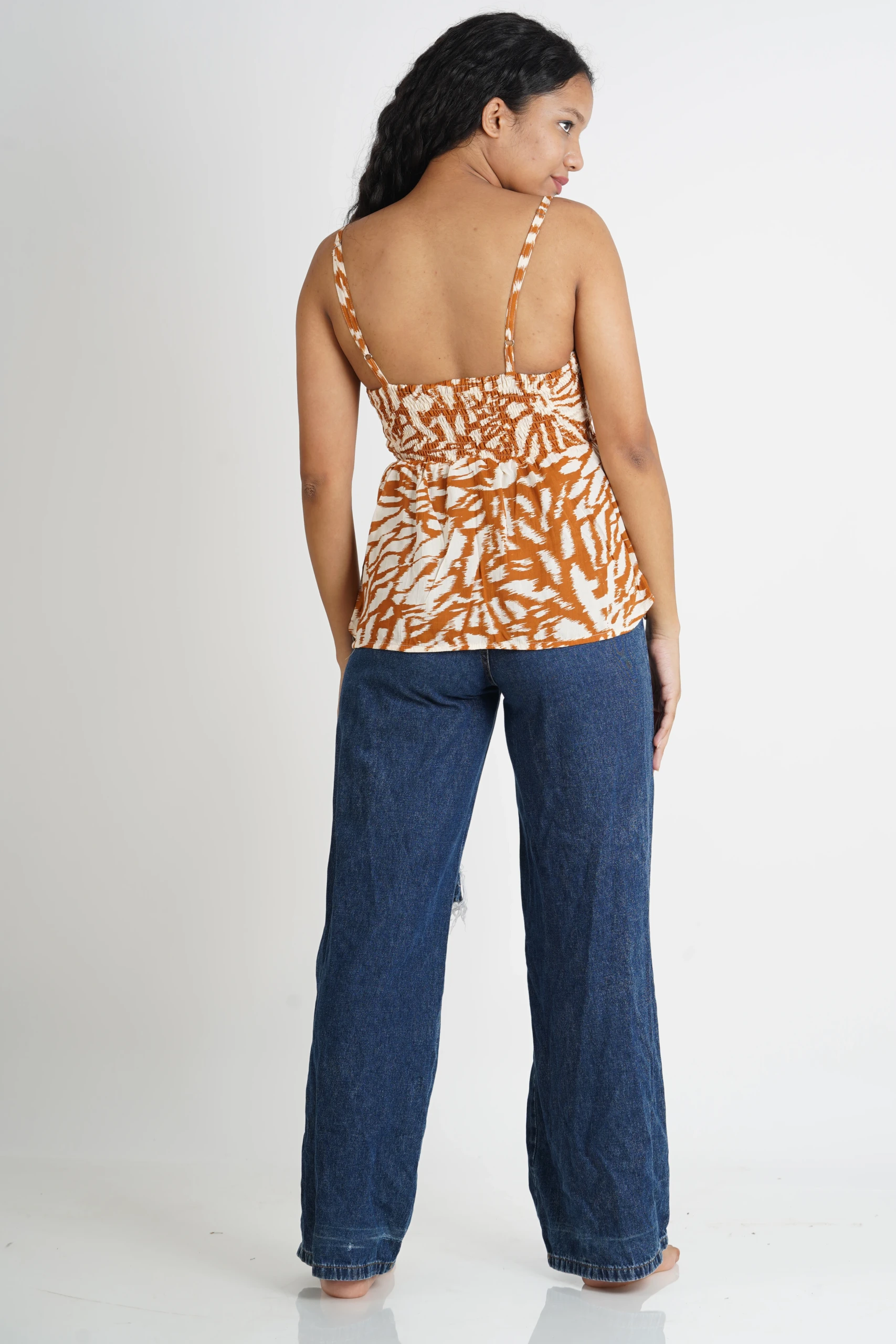FEATURES- Soft rayon fabrication, deep V-neckline, twisted bust, smocked back, thin adjustable shoulder straps,sleeveless silhouette.