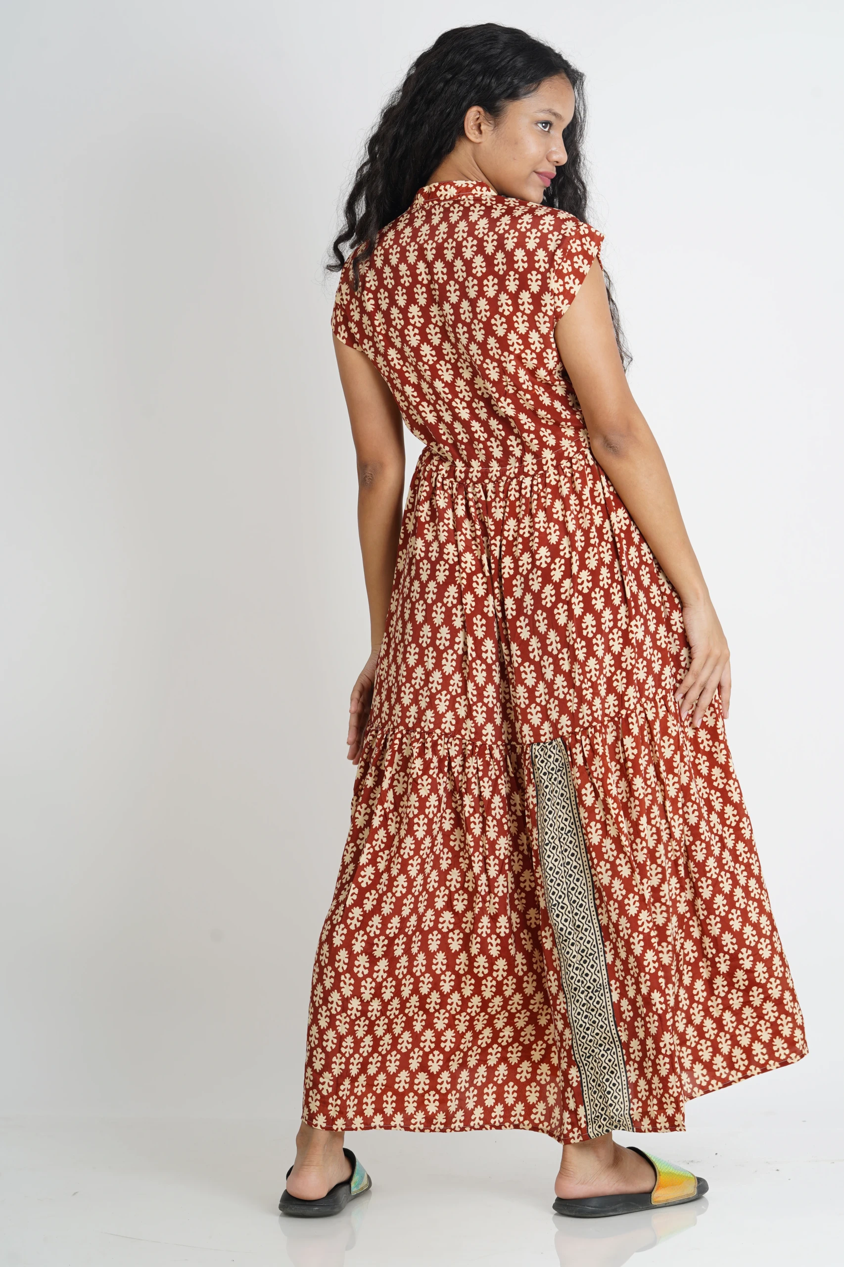FEATURES- Mao collar neckline, button-up closure, armed cap sleeves, adjustable string under the bust, tiered hem.