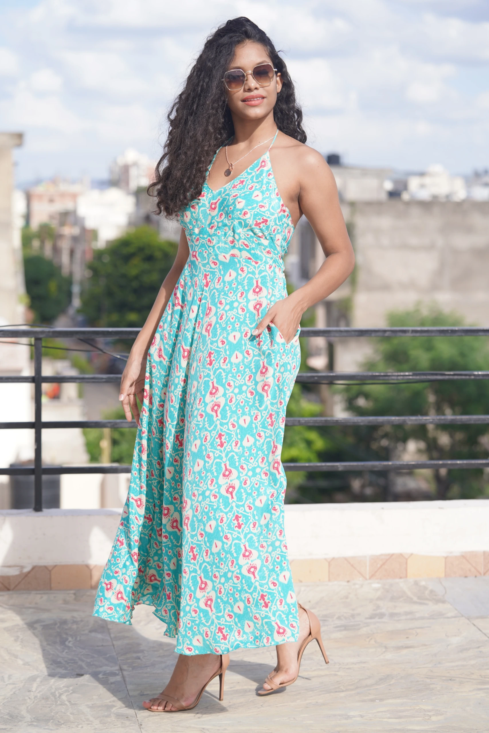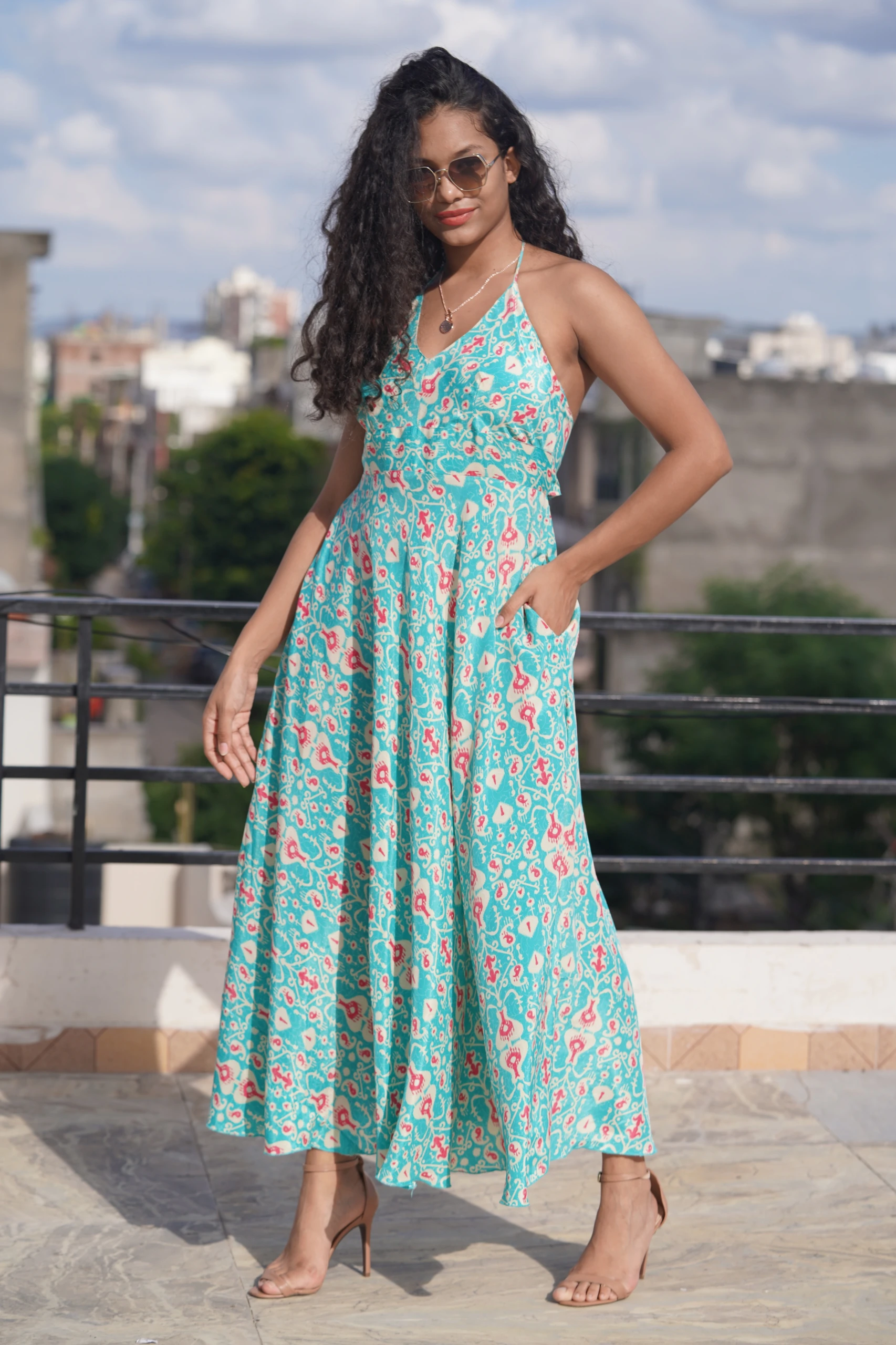 FEATURES- soft sari silk fabrication, V-neckline, backless design with adjustable tie, tie-back neckline dropped armholes, side pockets.